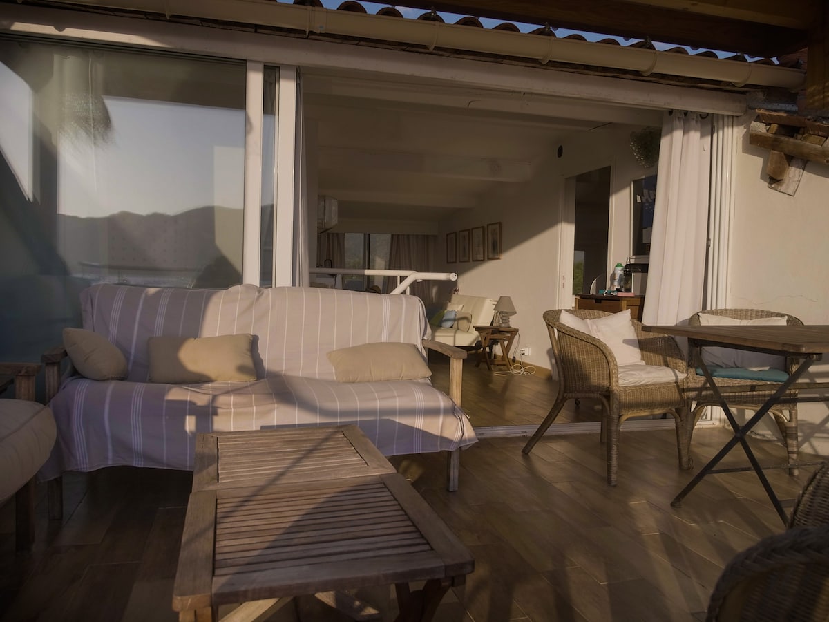 On the heights of Saint-Florent, under eucalyptus and umbrella pines, with a fantastic view over the bay. A 3 bedroom, 2 bathrooms apartment opened on a terrace on the bay. Very quiet and zen environment with non smoking in the apartment and on the terrace. For 4 personnes and 3 children. No smoking area inside the apartment and in the terraces.