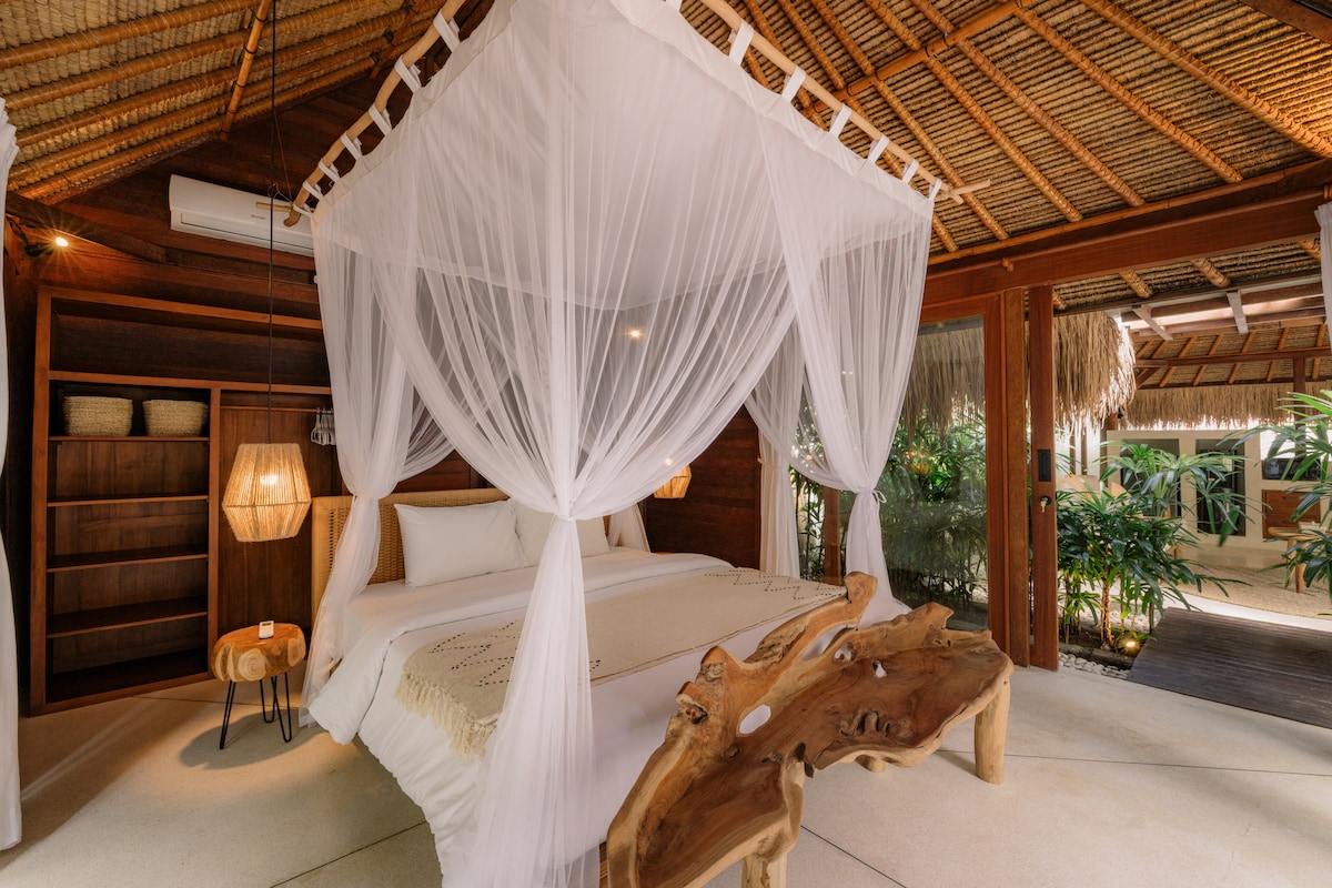 Deluxe Room 2 - A tranquil escape designed for comfort and harmony. Room 2 offers a private pool and a large garden wrapped in vibrant tropical greens, complemented by a natural wooden deck for lounging or quiet moments. The interior embodies modern tropical elegance, combining natural textures and soft neutral tones to evoke calm. The alang-alang roof and open layout create a refreshing sense of flow between indoors and outdoors — an invitation to slow down and reconnect.