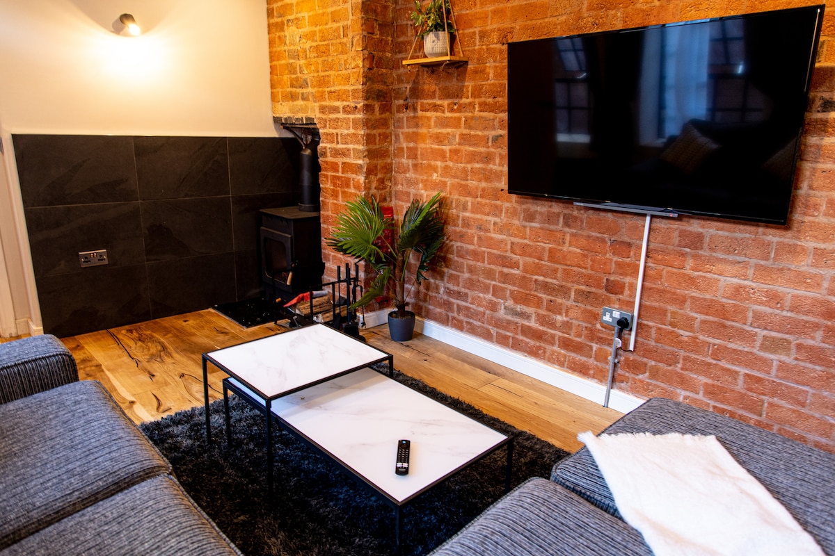 Industrial Jewellery Quarter townhouse - Electric Blinds, drop down working fireplace, CAST iron windows & radiators feature throughout. which was a old warehouse. It is set down a private path. It is quiet and peaceful. The house benefits from 3 bedrooms; king size ( or twin beds) , queen size bed and a double all with their own Bathroom (3x). There is also a sofa bed. The kitchen is open plan onto the living room and has a log burner for those cold winter evenings.