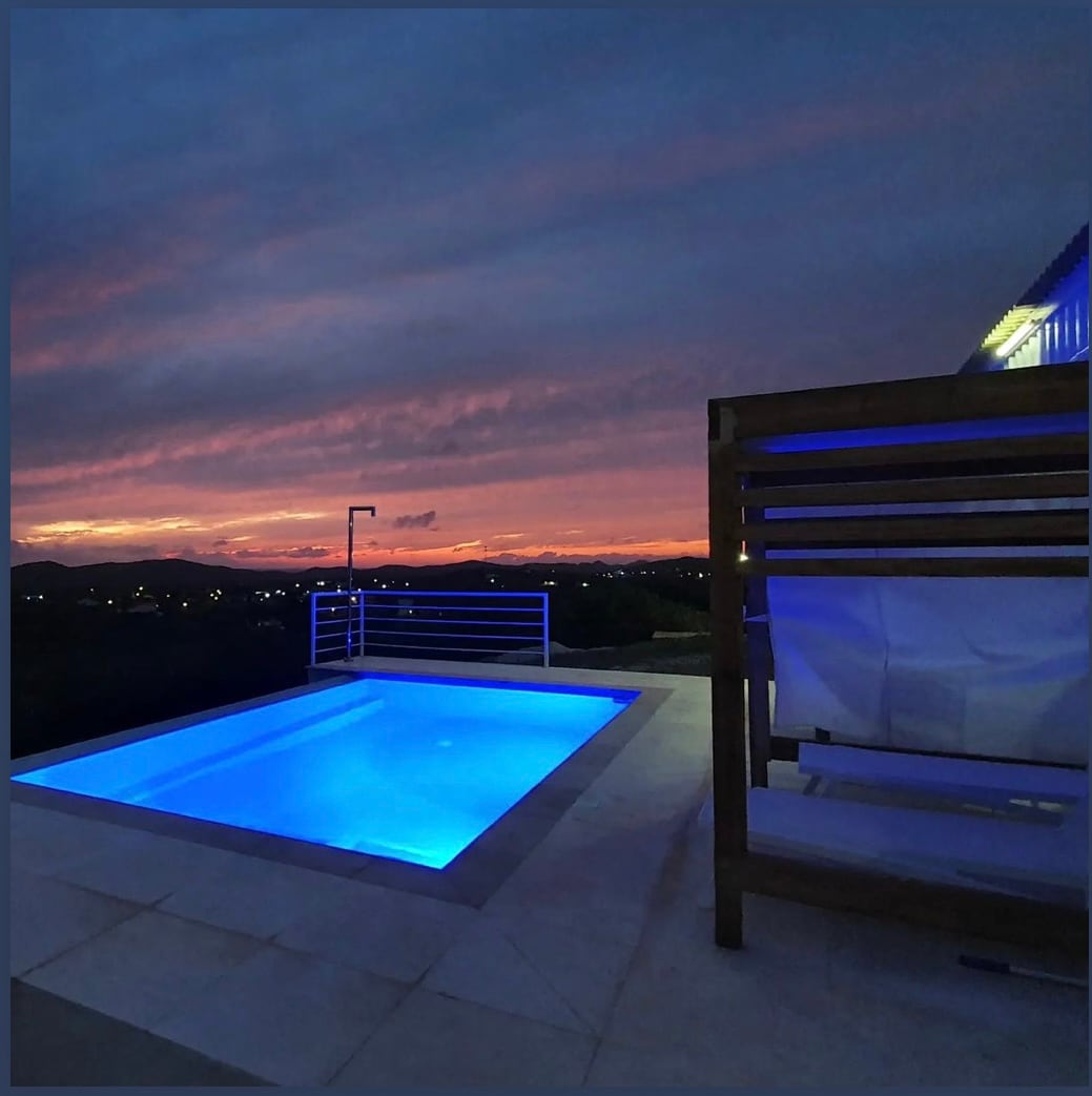 This unique 3D-printed concrete house features a private cave with direct ocean access. Step from the bungalow into the cave, and dive into the crystal-clear Caribbean waters. Spot dolphins, tuna, and vibrant coral while snorkeling. We provide the gear, cooling jug, sups for free. Enjoy a cocktail in the cliffside jacuzzi with stunning sea views and the best sunsets on the island. The property has two private, mirror-image bungalows. Contact us to rent both, to have everything exclusive.