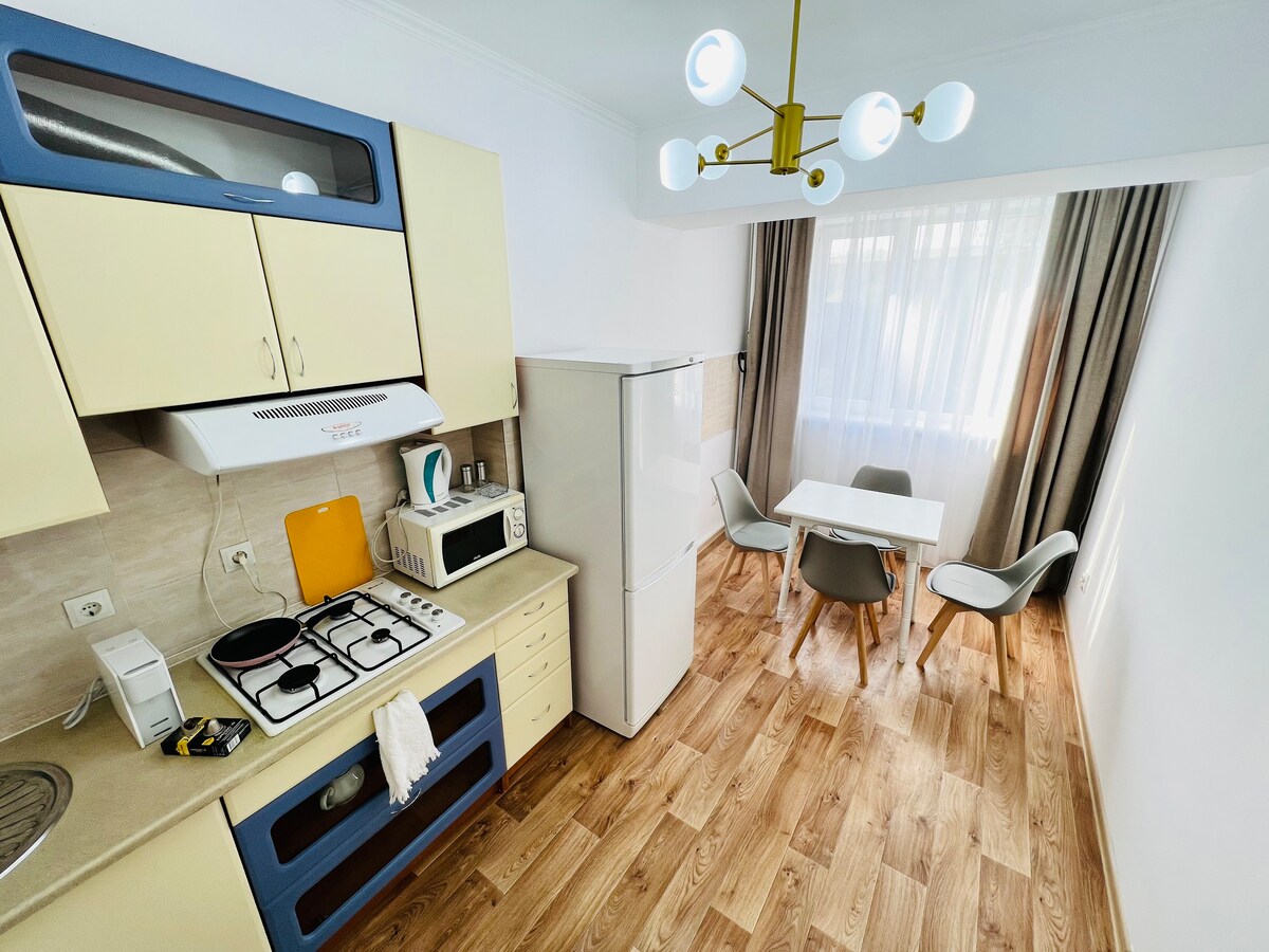 Cozy two-room apartment in a European style with all essentials, ideal for one guest or a family of two people. The apartment is located near Panfilov Park, the hospital, the post office, the pharmacy, the dentist, and the hairdresser. It is in the very center and has access to malls, supermarkets, many shops including lots of national ones, bars, cafés, and restaurants. Also there is free parking, an ATM, and an exchange office not far away.