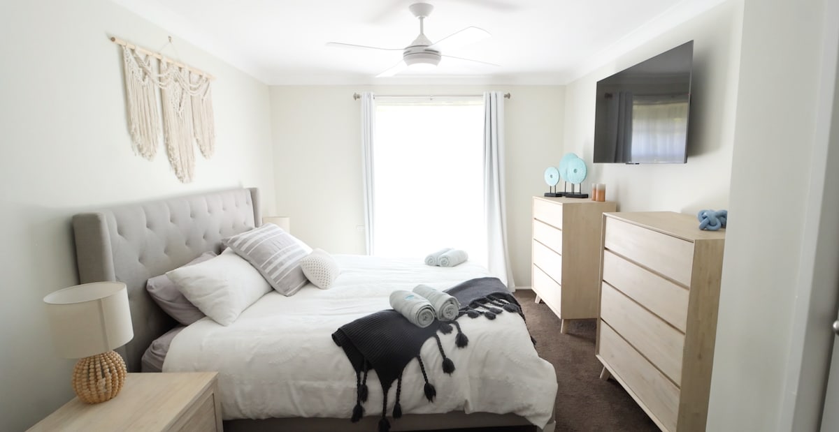 Situated between the beach & the lake at the end of a quiet cul-de-sac with a picturesque lagoon view! And only metres away from access to the famous new Fernleigh Track! This one bedroom fully equipped cozy house is brand new & spotlessly clean! Fully equipped with all linen, towels, soaps, shampoos, toilet paper, Nespresso coffee machine + coffee pods, kettle, instant coffee, tea bags, sugar, toaster, air fryer & all your kitchen essentials.
