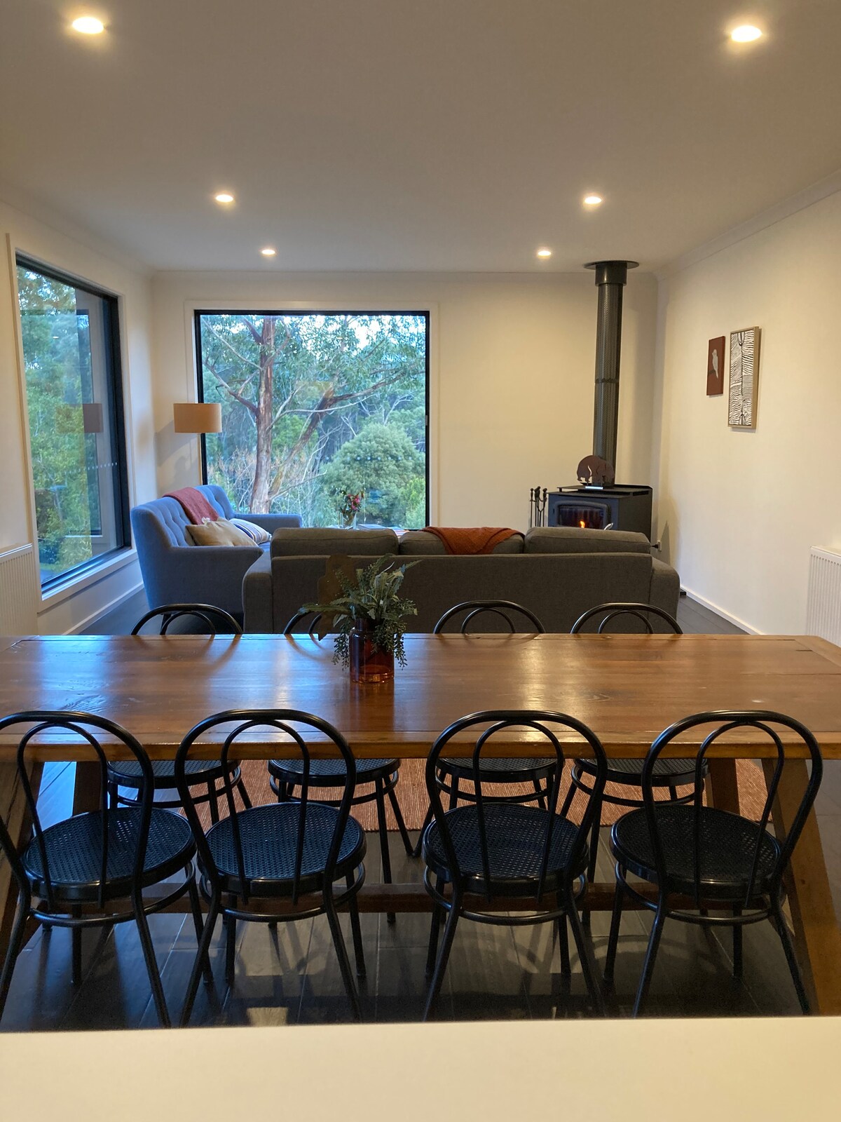 An almost entirely open plan house with a vast master bedroom upstairs and a bunk room downstairs, the house sleeps up to six, with a modern kitchen, wood fire, outside deck and large garden, set close by the Wombat State Forest. Suitable for children over five. Pet friendly. Blackwood 'Treetops' is also work friendly as the house has a large desk with landline and internet access. Due to the coronavirus, we are taking extra care to disinfect frequently touched surfaces between reservations.
