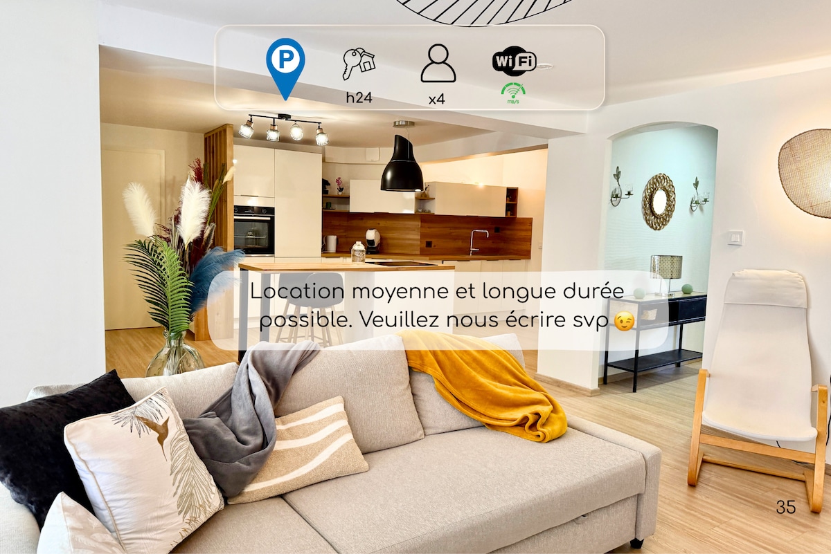 Come and discover this superb accommodation, tastefully decorated in a modern and refined style. Completely new in 2025, it has an elegant bedroom equipped with custom furniture, as well as a comfortable sofa bed that can accommodate up to four people. The accommodation also includes a slightly separate office space, ideal for remote working. Enjoy optimal comfort with a smart TV and high-speed internet connection, for moments of relaxation.