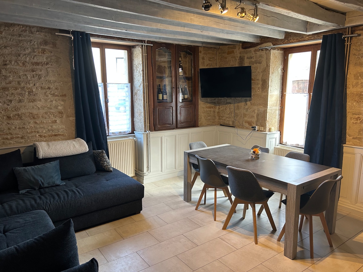 Cool, comfortable and spacious (90m2) home on 2 floors. Large kitchen , lounge and terrace on street level and fabulous 1 double bedroom open plan room on the 2nd floor. A converted grange perched on a mountain in a medieval village 16 minutes from the A6, this peaceful home makes an ideal stop over for holidays in the Alps or south of France. Please note - there is a studio apartment with its own entrance on the lower ground floor - rented separately.