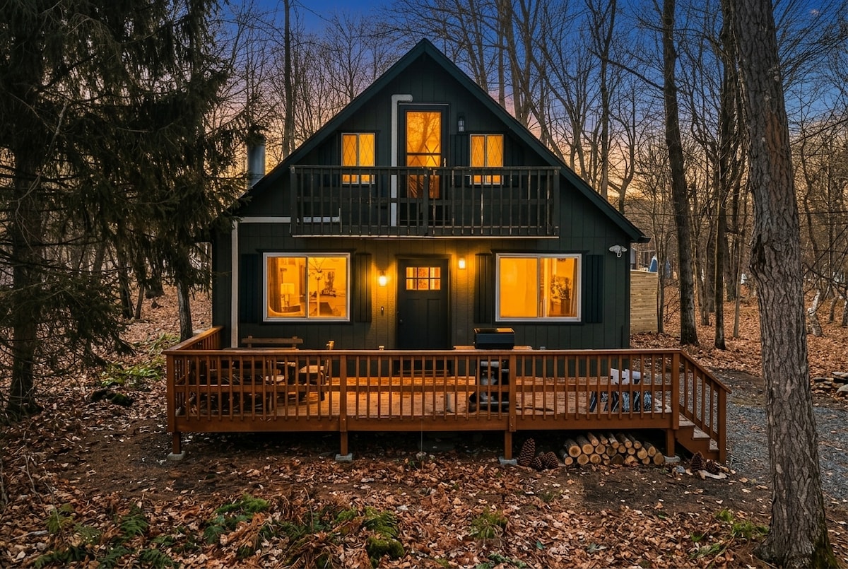 Escape to Bear Rock on Birch — a private Pocono retreat backing to State Game Lands. Soak in the hot tub under the stars, gather around the firepit, or relax by the fireplace after a day at the slopes or lake. This modern 4BR, 2.5BA home sleeps 8 and is dog-friendly. Enjoy the king suite, open layout, and wraparound deck surrounded by trees. Minutes to skiing, hiking, and dining — perfect for a cozy winter escape or spring reset.