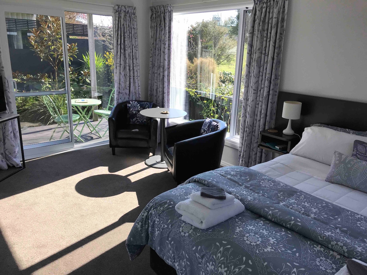 Korurahi Retreat offers peaceful gardens tucked away down a private driveway with off street parking. A comfortably appointed studio with a spacious relaxed sitting area with views to the garden. The king size bed has quality linen for your comfort with locally made natural products in the shower room. A well equipped kitchen has everything you will need with an air fryer/oven, microwave, electric frying pan and coffee machine. No stairs to worry about as everything is on ground level.