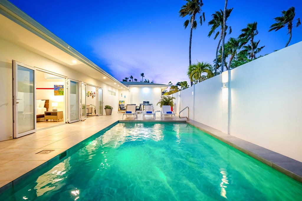 Modern single-level private villa steps from Palm Beach. This stylish 4-bedroom home features high ceilings, a spacious open layout, and a large private pool deck perfect for relaxing or entertaining. Each bedroom has an en-suite bathroom, Smart TV, dedicated workspace, Aruba Aloe toiletries. Family amenities like a crib and high chair. Pet-friendly, fully fenced for privacy and walking distance to beaches, restaurants, shops, and Arubaâs best nightlifeâyour ideal retreat in the Palm Beach area.
