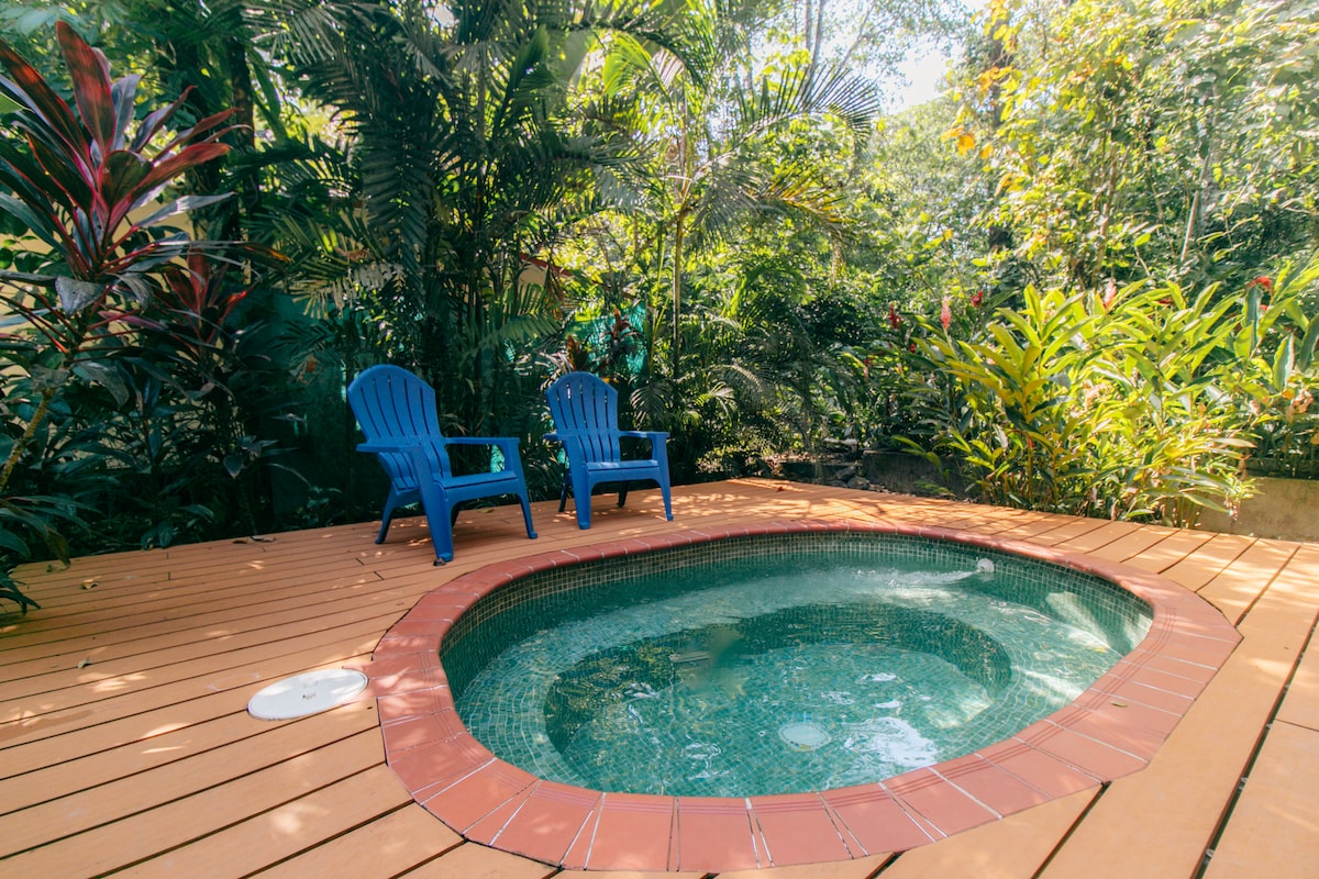 This modern style tiny home is located a beautiful jungle settings. Enjoy monkeys and birds from the comfort of your luxurious king size bed, sofa couch, or twin beds in our vaulted loft viewing and sleeping area. Escape the heat and bugs with our AC cooled indoor area. A screened kitchen with appliances to prepare almost any meal. And a great bathroom with private outdoor shower to truly enjoy nature. We have games, books, and a smart tv to keep you busy on those rainy days. Enjoy!