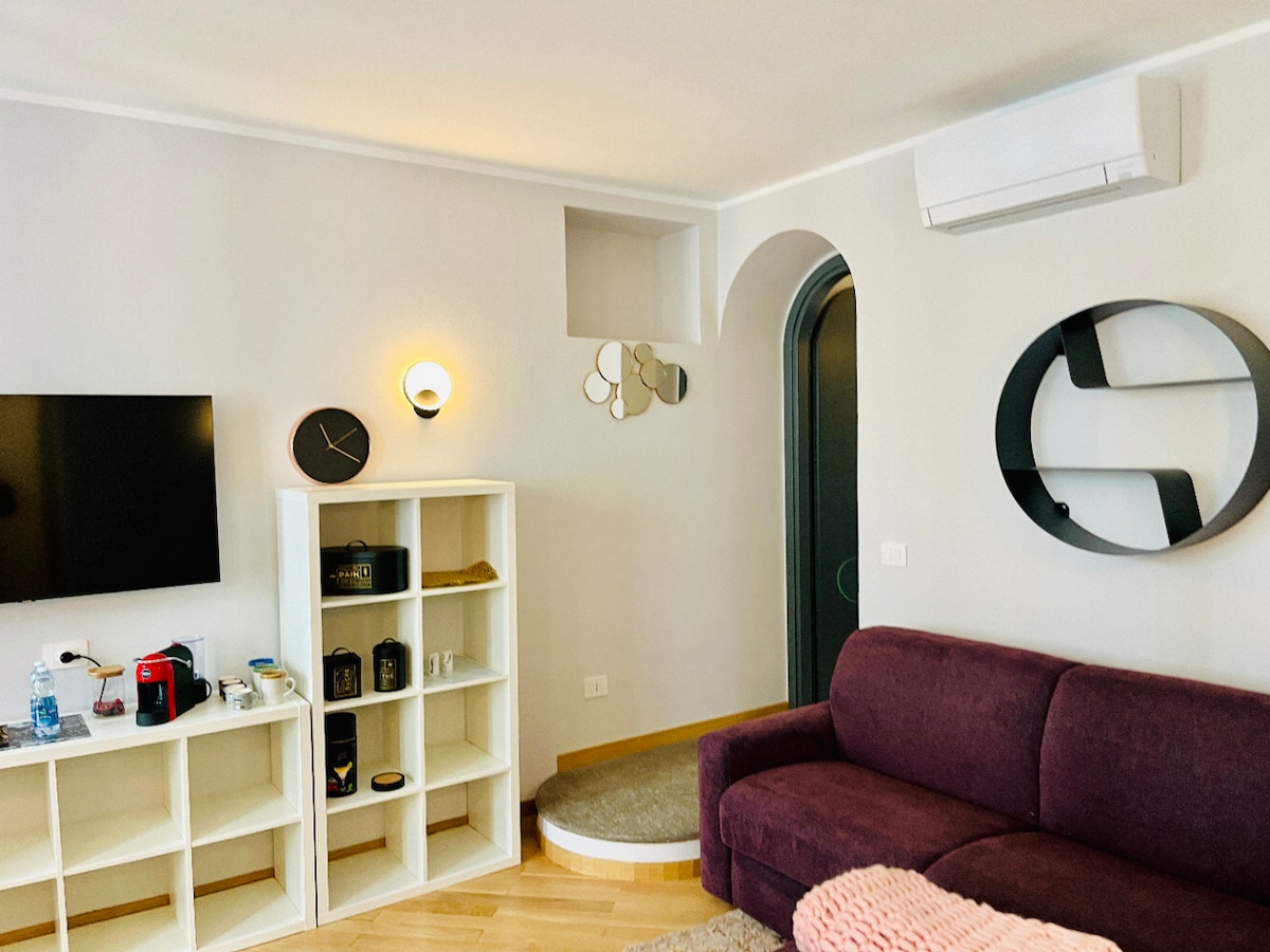 This one room apartment is split on two levels, with a cozy bedroom hosted in a wooden mezzanine, open on the living area. The kitchen area accommodates all the appliances, including a dishwasher, a washer/drier and a traditional oven. The bathroom, equipped with Italian ceramics and stainless steel fittings. Independent heating and air conditioning allow apartment temperature control in any season. A Smart TV with 32 inches screen and high speed fiber internet connection with Wi-Fi