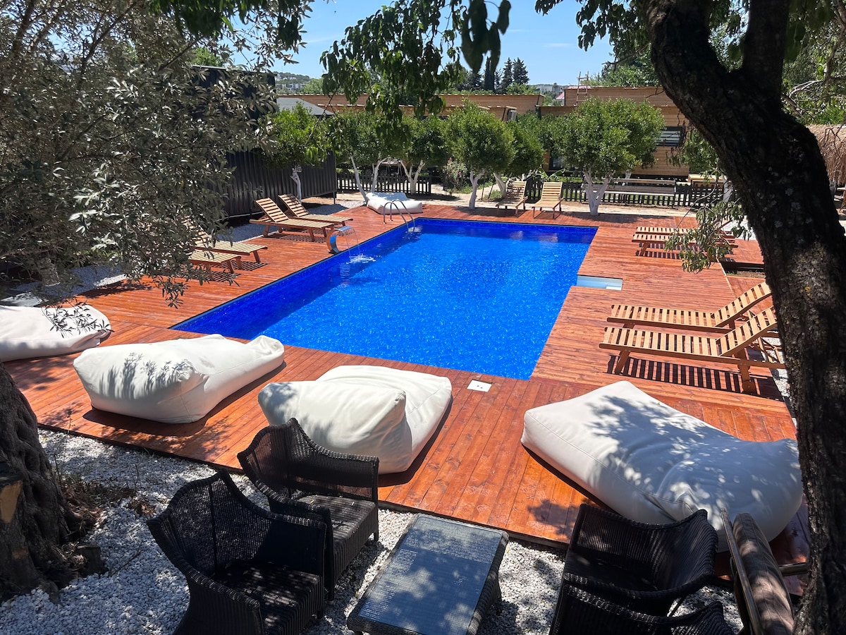 A comfortable Tiny House in a natural wonder campsite in the center of Bodrum, Gümüşlük, just 106 steps from the sea, where you can relieve all the fatigue of the year, away from noise, under the tangerine trees, where you can wake up with the chirping of birds. Just bring your suitcase. Our prices are set per night for 3 people, including breakfast. Our breakfast price for the 4th person is 300 TL.