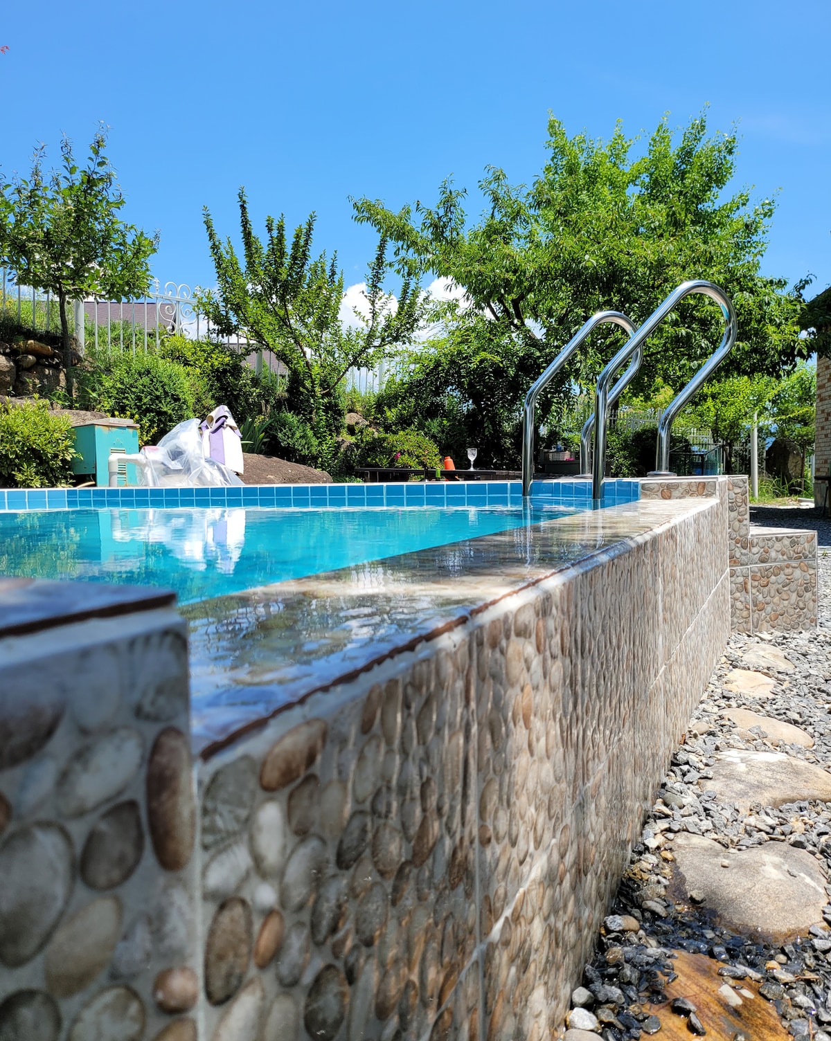 30 minutes from Cheongju, it is a beautiful pension full of sunlight near a recreational forest, valley, and arboretum. We recommend it for those who want a comfortable rest in the bosom of nature. This is a separate building next to the main building, with a swimming pool, fireplace, barbecue, karaoke, 100-inch Netflix, garden, and parking available. The manager resides in the main building, so you can get help whenever you need it. It is located in a very good place geographically in terms of wind and rain as it is full of sunlight all day long in the south. There are swings and sand play in a 200-pyeong space, so it is good for children to play, and you can also use the tea house while watching the stars at night. Vegetables in the garden are provided free of charge, and you can also experience the loess room. Nearby attractions include valleys and recreational forests. Barbecue is not allowed indoors, but there is a barbecue area where you can eat warmly outdoors. You can also use the karaoke room installed in the barbecue area. Come to Sunny Stay, where spring, summer, autumn, and winter are beautiful^^
