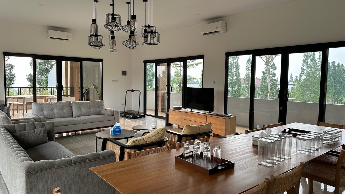 This two-story house in Kertamaya, Bogor offers comfortable accommodation with three queen-sized bedrooms (one located on the ground floor, and two upstairs). Includes 2.5 bathrooms and a semi-outdoor kitchen. Guests can enjoy a private swimming pool. There are two living rooms on each floor, with a Google TV available in the upstairs living area and the downstairs bedroom. Amenities include a private garage with parking for up to two cars, EV charger, and a rooftop area with seating.