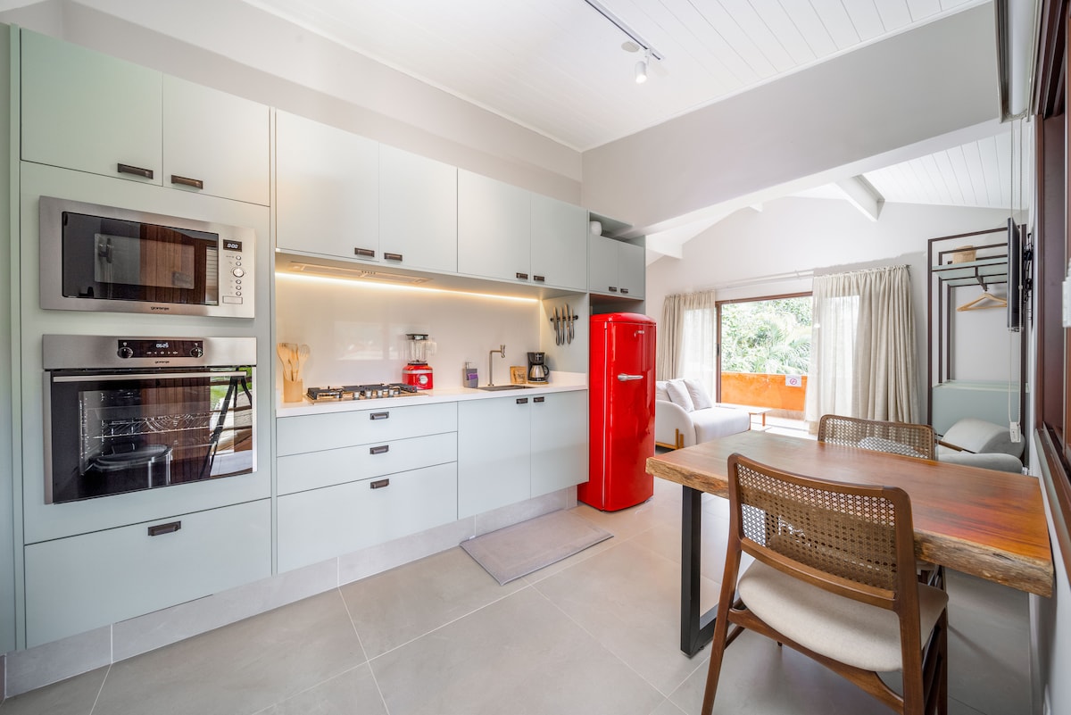 Studio com 1 cama king size, lençóis 400 fios, toalhas de banho e praia. Os hóspedes terão uma experiência especial, pois este estúdio dispõe de vista para o mar e banheira com vista para mata. Cozinha completa. One of the best apartments in Juquehy beach overlooking the ocean and rainforest. 300 meters from the beach, close to good waves and surf. Unwind here, enjoy the mix of nature, luxury and modern rustic architecture.