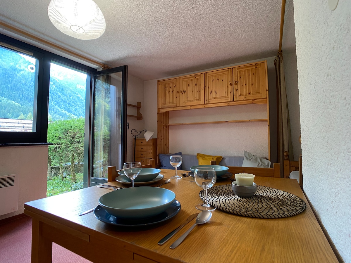 Enjoy this peaceful retreat with panoramic views of the Aiguille du Midi and Mont Blanc. You will feel like you are in the middle of nature thanks to the wooded park and the river located at the foot of the studio. Only a 6-minute walk from the pedestrian street, bus station and train stop, 10 minutes from the departure of the Aiguille du Midi cable car. You can leave your vehicle in the private parking lot and enjoy the free shuttles serving the valley.