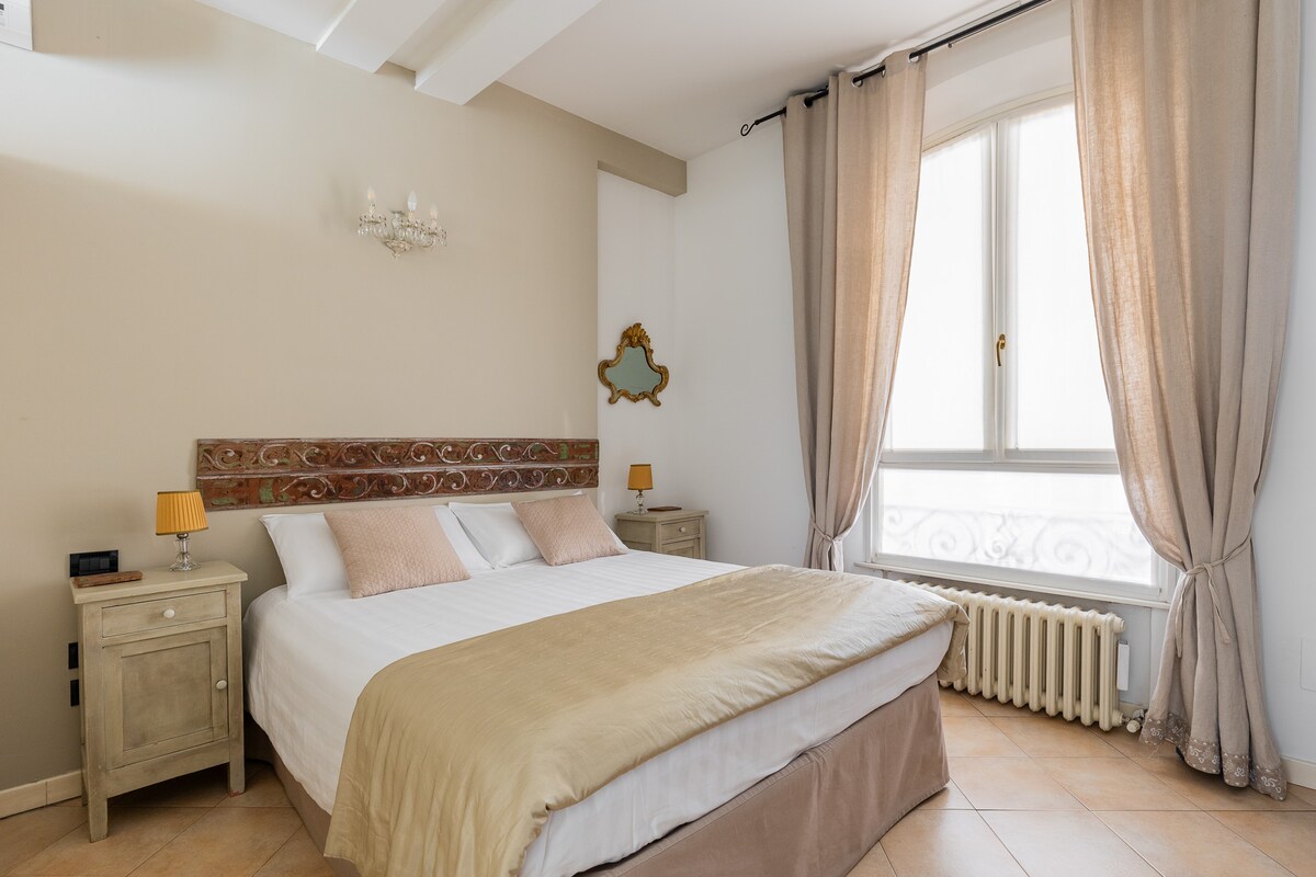Inserted in a building located in the historic Via Clavature (the street of the "ciavadur" - ed. "locksmiths" -, where their shops were once located) the suite, located on the second floor, benefits from a recent and modern renovation that has maintained the original wooden beam of the ceiling dating back to 1380, thus making it an integral part of the furnishings. Clavature Suite is a small 35 sqm gem located in a quiet and very central setting.