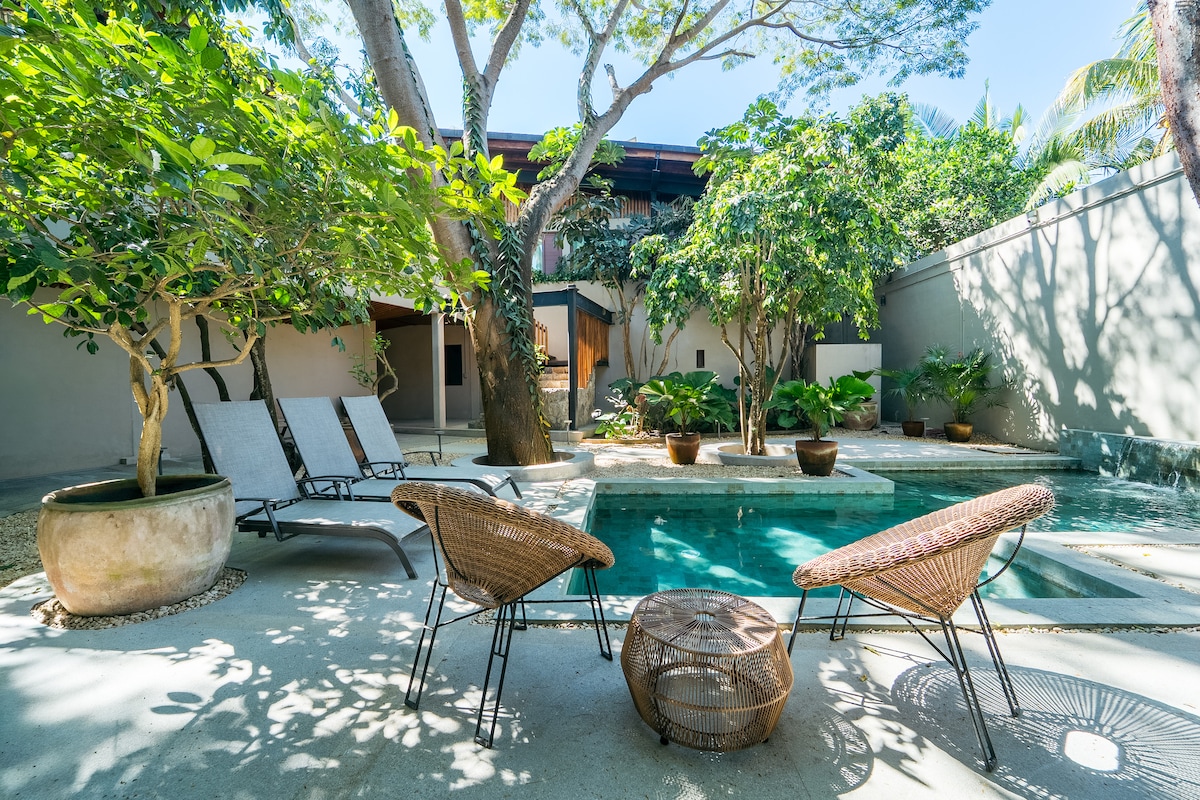 The Palm Tree House at Casitas Patz was designed to live in connection with nature from comfort and beauty. It is surrounded by the tropical jungle and steps from a beautiful beach only known by locals. On one side of the house, you can also enjoy some small waterfalls with natural ponds to cool off and enjoy the sound of running water. The water is completely natural, chemical free. The fish and plants of the last pond help us keep the water clean and create an incredible ecosystem.