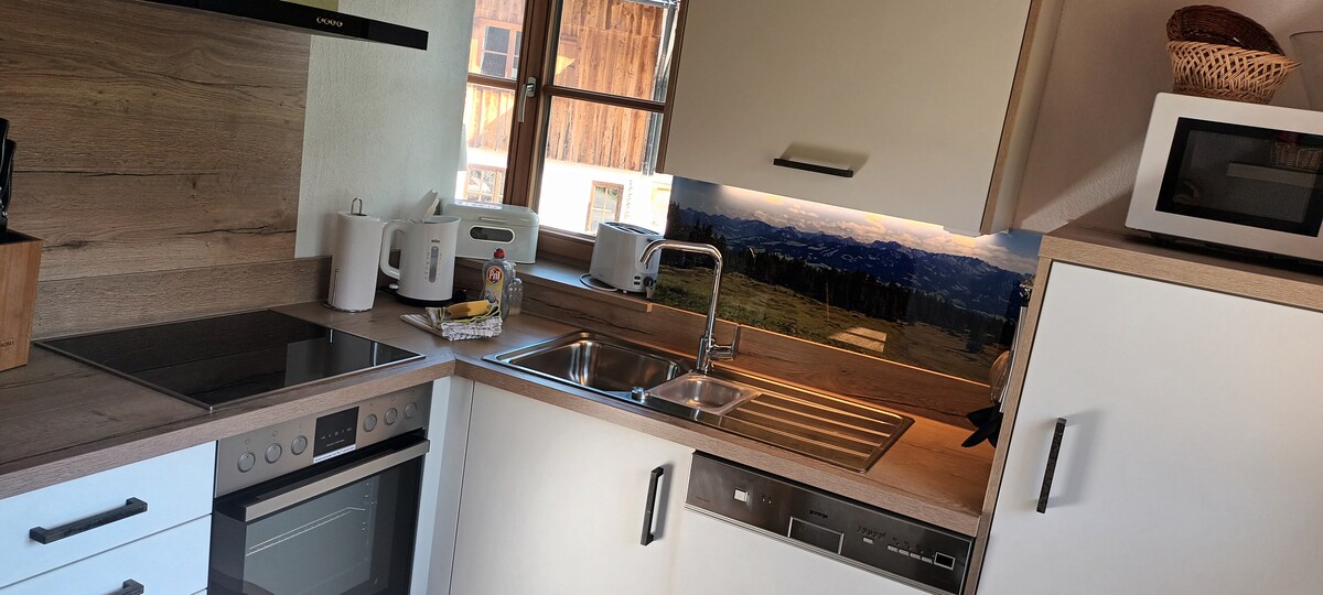 Our house is about 300 years old - a typical Allgäu settler house made of wood, of which there are fewer and fewer. We have extensively ecologically restored it and equipped it with all the modern comforts you could wish for: ceramic stove, oven, washing machine, microwave, oversized shower, washing machine, Wi-Fi, etc. If you heat with wood in winter, the whole house smells cozy. Clay plaster ensures a cozy indoor climate. Right on your doorstep you will find a bakery and dairy.