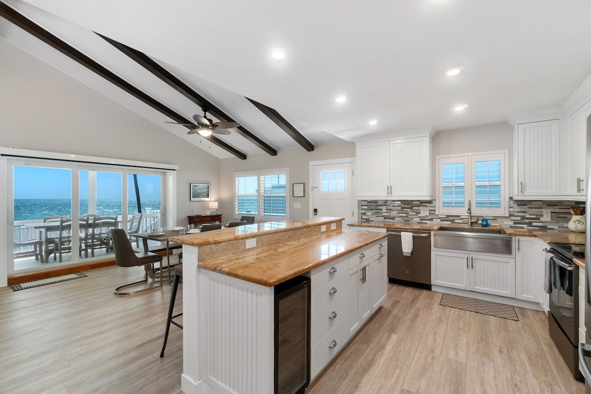 This stunning Bonita home is steps from the beach. It combines modern luxury with artistic flair. The home features a striking wave stained-glass window and cozy sitting nook which provides an ideal spot to watch mesmerizing sunsets. The chef’s kitchen flows into the great room and dining area, where a large picture window frames serene views of palms. The home has a generous outdoor deck. It features three beautiful bedrooms and two full bathrooms, each designed luxuriously.