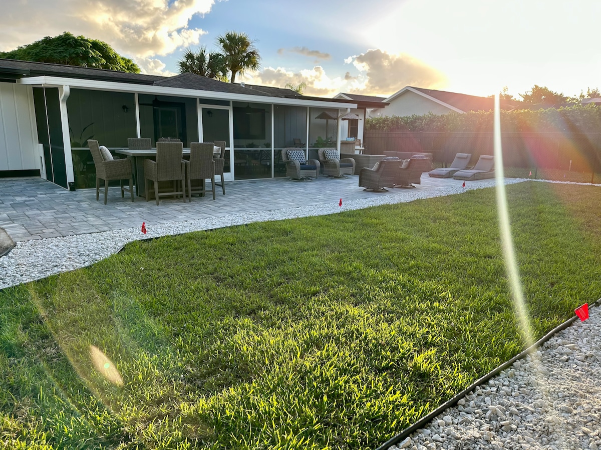 Relax with the whole family at this peaceful place to stay which features: *2200 Sq. Ft *10-foot windows and doors *Private large, screened in Lanai *Large heated SaltwaterPool & Spa *Outdoor kitchen, living room w/TV, and dining area *Fully stocked and equipped Kitchen *Nespresso Coffee Machine *Off street parking, driveway will accomodate 2 vehicles *Safe Neighborhood *On the canal. Room to tie up a boat or two *1 walkable Mile to coffee shops, and several restaurants