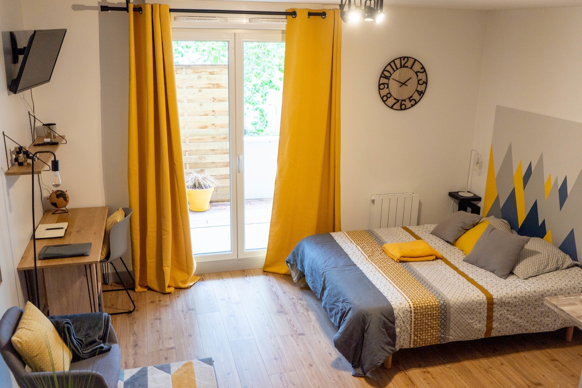 You will be in a warm and cozy 50 m2 home Located in a detached house with separate entrance, very quiet, on the ground floor giving you access to the outdoor garden furniture allowing you to dine outdoors and rest in the shade of a cherry tree, facing the mountains. Large parking lot Quick access to the city center: all shops, media library, castle, cinema, swimming pool.