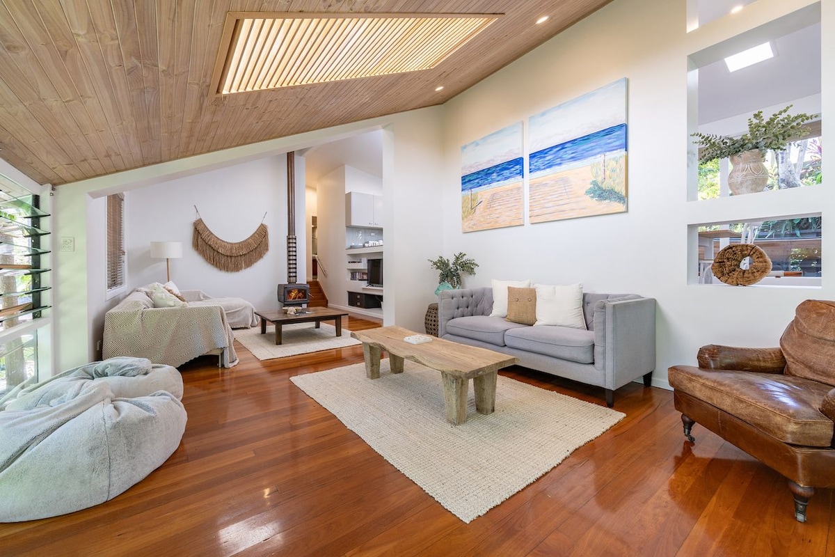 A relaxing coastal escape awaits at Hideaway at Lizzie, a beautifully styled four-bedroom, three-bathroom home set among peaceful bushland just moments from Elizabeth Beach and the Pacific Palms Rec Club. Enjoy slow mornings on the deck, swims in the private saltwater pool, and chilled nights in. With soaring ceilings, ducted air conditioning and an open fire, it’s ideal for families, couples, friends — and their pets. A place to slow down, connect, and make lasting memories. hideawayatlizzie