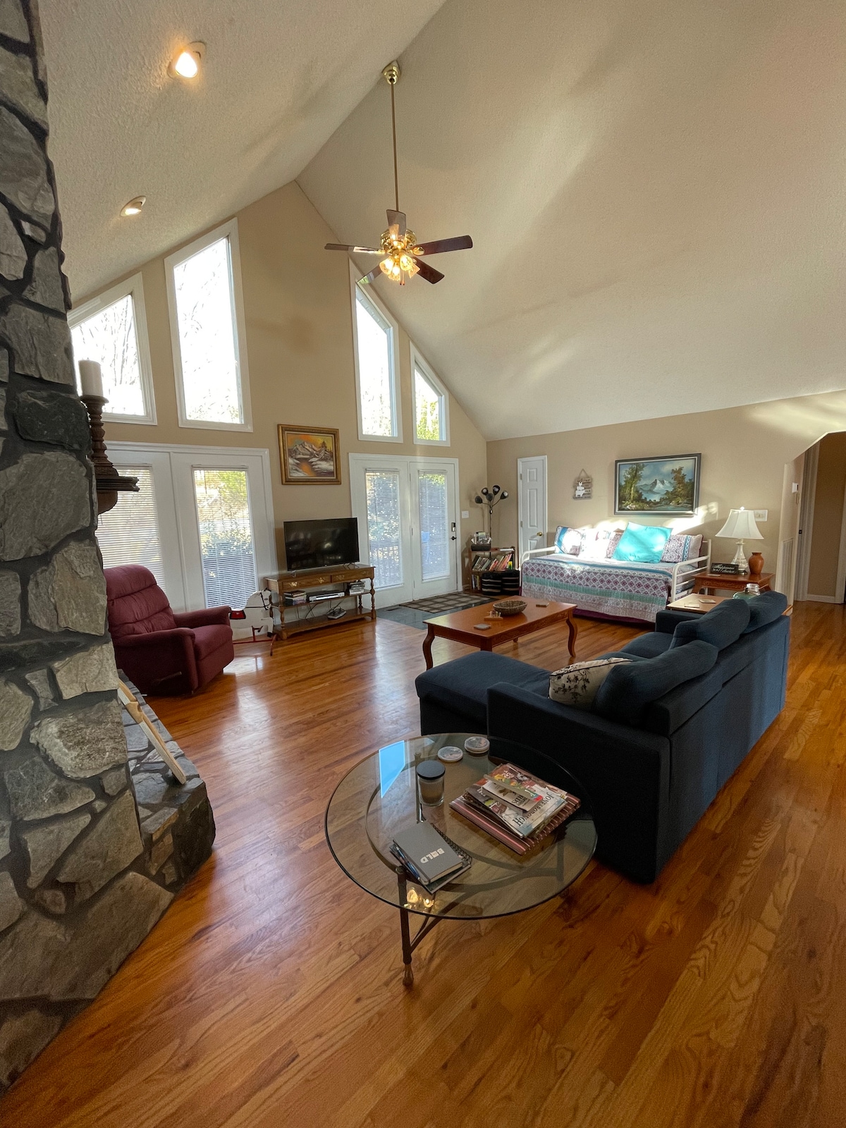 Nestled among the trees, Blue Haven Log Cabin sits atop a sloping hill and welcomes those looking for that perfect getaway to connect with loved ones either on the large front porch with a view of the mountains or on the patio below. A stone fireplace and rustic furniture gives it a sense of days gone by . The large stained glass window at the eave of a 22 foot cathedral ceiling cast every hue of blue onto the ceiling, loft and floor at different times of day. Host next door if needed.