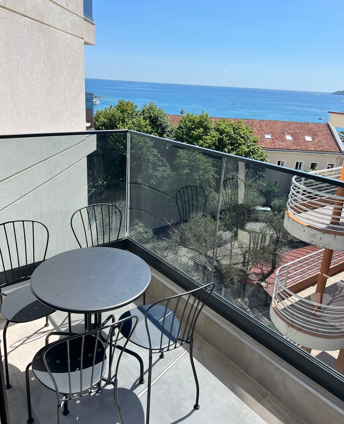 Experience refined comfort with the whole family—our space offers the perfect blend of luxury design and a true beachside atmosphere. Unwind with a stunning 180 degree view of the Adriatic Sea, 4-minute stroll to the famous Becici beach and right by a rich variety of cafes, restaurants and supermarkets. ✔ Spacious private balcony with 180* sea view ✔ Free private parking ✔ 72 sqm, 2 bedrooms ✔ 4 minute walk to the beach ✔ Infinity pool ✔ Beauty salon and restaurant on-site ✔ Elevator access