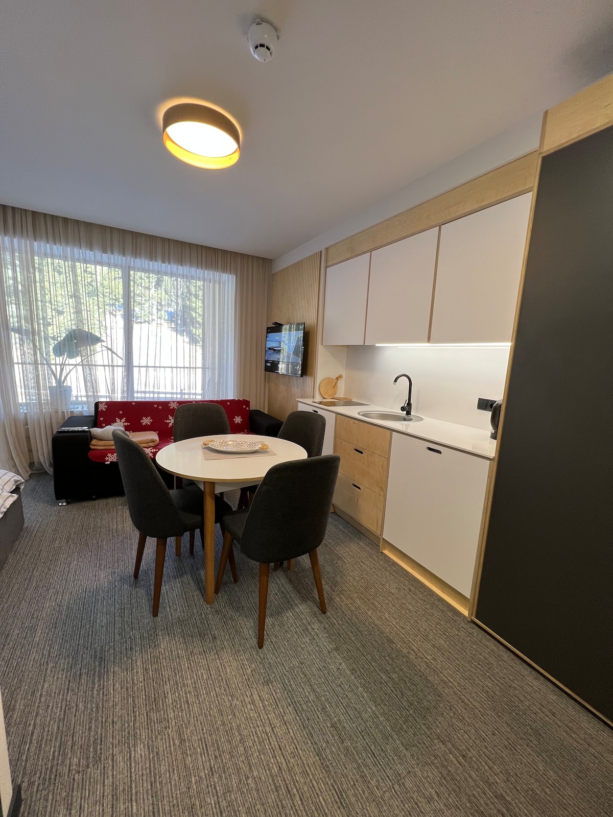 Stylish&cozy 41 sq.m apartment is located at Crystal Residence Hotel (room 305) near Didveli and Tatra mounts. Apt has 1 bedroom w/double bed (180 sm), a living room w/2 sofas and a balcony (access from both rooms) w/view at forest, slopes&ski lifts). Hotel has its skiing slopes (4 km for day/night skiing and 350m for kids), Crystal Park&ice skating rink. Perfect also in summer as the place has” its own” forest w/great chilling areas, a paid pool and playgrounds for sports enthusiasts & kids.