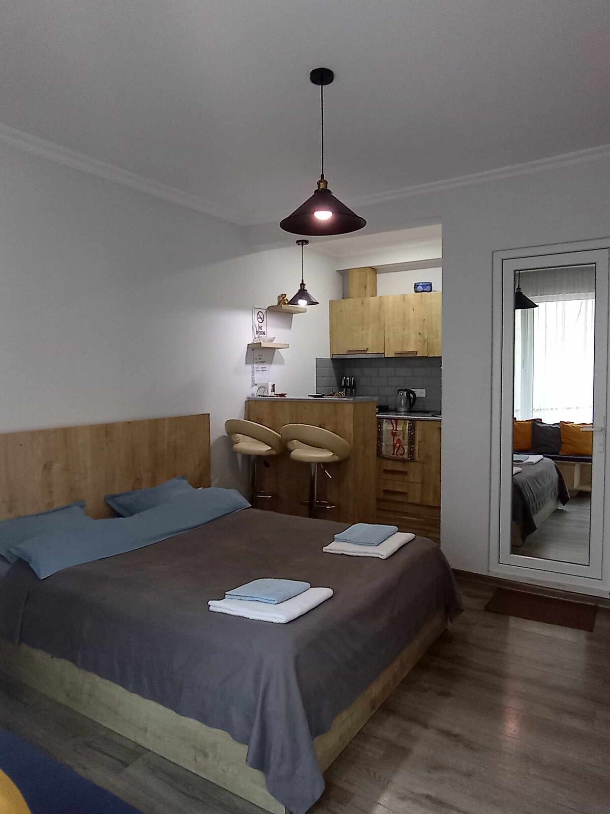 Our cozy apartment is located in one of the most beautiful and special places in Borjomi. Here you can enjoy amazing views of the mountain and the river, and spend time with your loved one in a peaceful environment. The building is newly constructed, located 1.5km. away from the Central Park (5 min. to drive, 20 min. to walk); 10 min. walk to downtown,local stores,banks. The apartment: newly renovated, cozy and comfortable, with minimalist design; One space studio, with double-bed.
