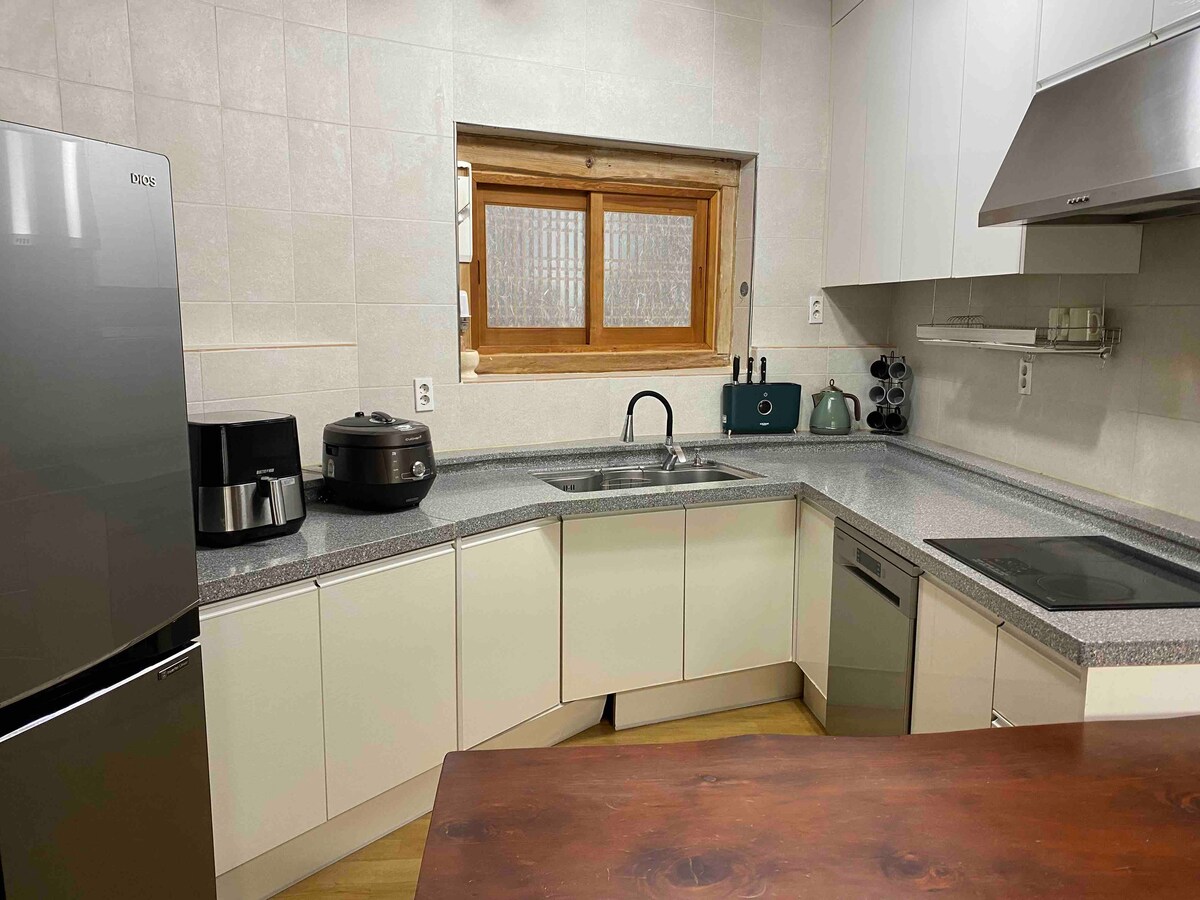 The warm atmosphere of a hanok where an ordinary old couple lived is maintained, and it has been refined into a new space with modern materials. From the beauty of the rafters made of Mudeung Mountain Japanese umbrella-pine tree to the traces of time and the sincere touch of the house, there are traces of time and sincere touch everywhere in the house. From the yard where the sunlight stays to the warm kitchen that fills your heart. You can use the whole house (private house) as comfortably as your own home.