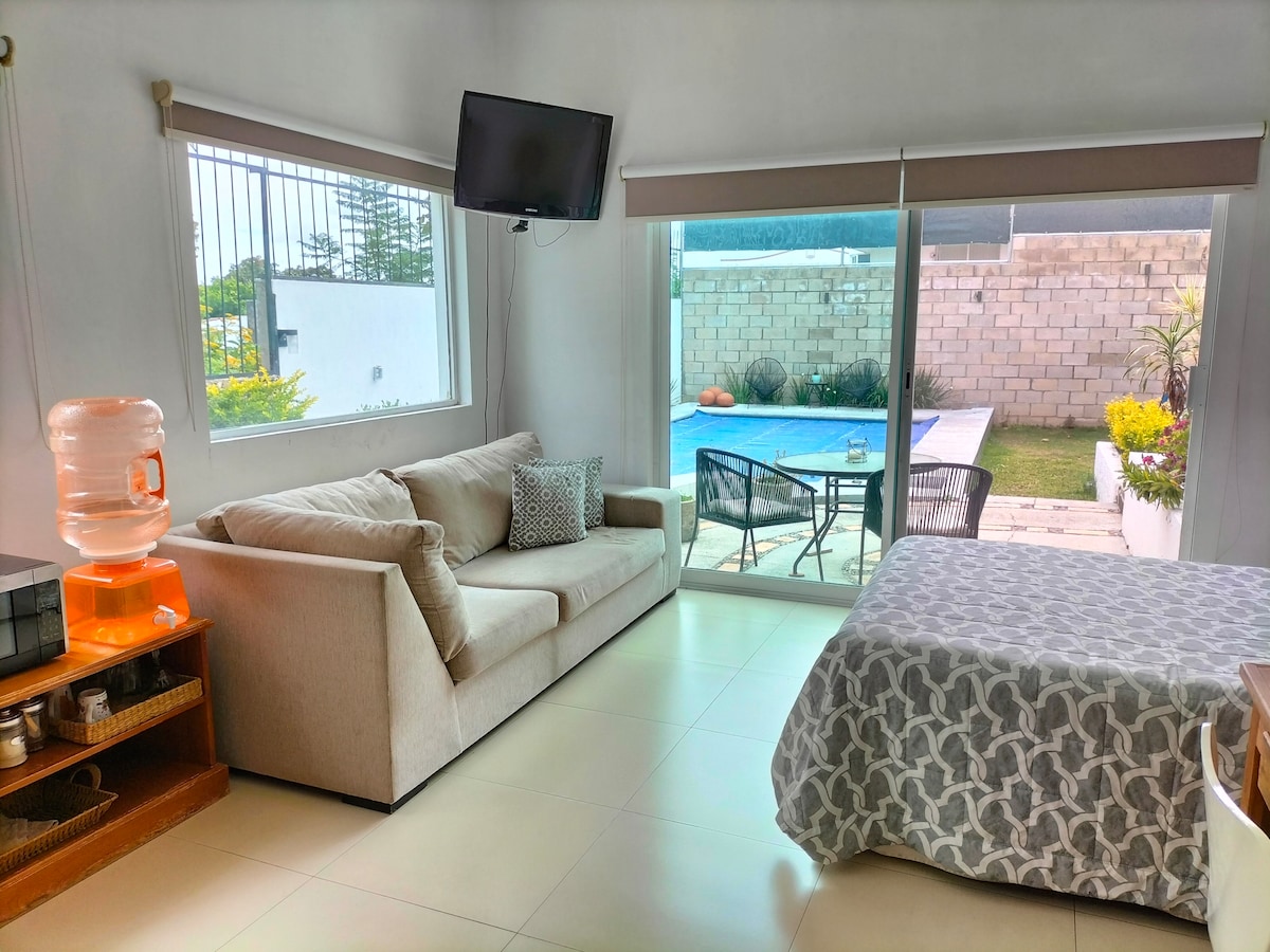 Spacious and independent room/studio with full private bathroom, quiet atmosphere. Ideal for relaxing or working. View of the city from the patio, as well as from the room towards the pool, garden and terrace. Inside the subdivision, you will find a park, church, viewpoints, and the entrance to the Magic Forest (Primavera). Here you can do outdoor activities such as hiking, jogging, cycling, and enjoy beautiful views.