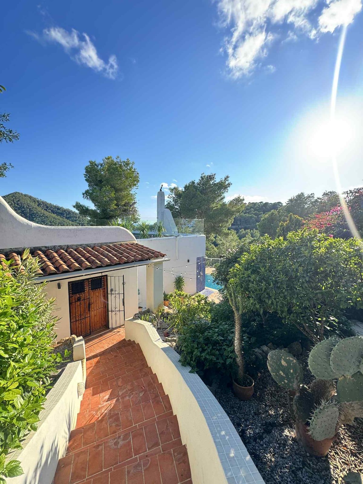 Charming house of 100m2, with interior patio with a small private pool, terrace tree-filled and rooftop sea view. Completely renovated in May 2018 and decorated in an ibicenco style, it is located in a quiet residence with a large pool overlooking the sea. It is 10 mn walk from Cala Tarida beach and 15 mn walk from Cala Moli beach, one of the most beautiful areas of the island. It has 3 bedrooms, 3 bathrooms and a fully equiped kitchen open to a spacious living / dining room. Ideal for families.