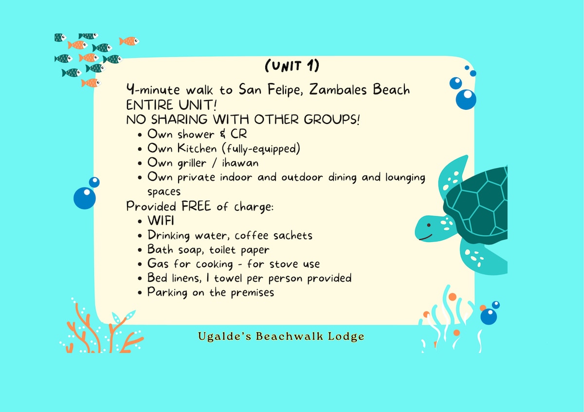 Sits directly on the West Philippine Sea. This cozy beach house has an insulated bedroom with 2 queen beds and a upper bunk for up to 6pax 7 yrs below are free of charge using existing beds. Air Conditioner, TV with movies includes free wireless internet access. Open sitting area overlooking the ocean and a kitchen and CR with hot water shower Simply fresh ocean breezes and sun and sand.