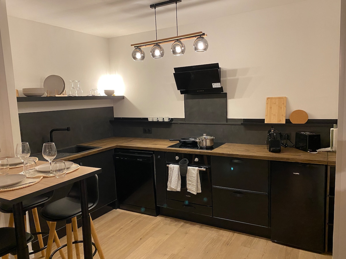 Relax in this quiet and stylish space. A comfortable apartment. Upstairs:a bright kitchen as well as a bathroom. Certainly small, it has been designed to offer you maximum comfort thanks to a spacious balneo bathtub to relax as a duo with its jet/massage options. On the ground floor, a living room with a convertible bed and small adjoining bedroom. A bay window will bring you natural light and provide access to an outdoor area with a table.