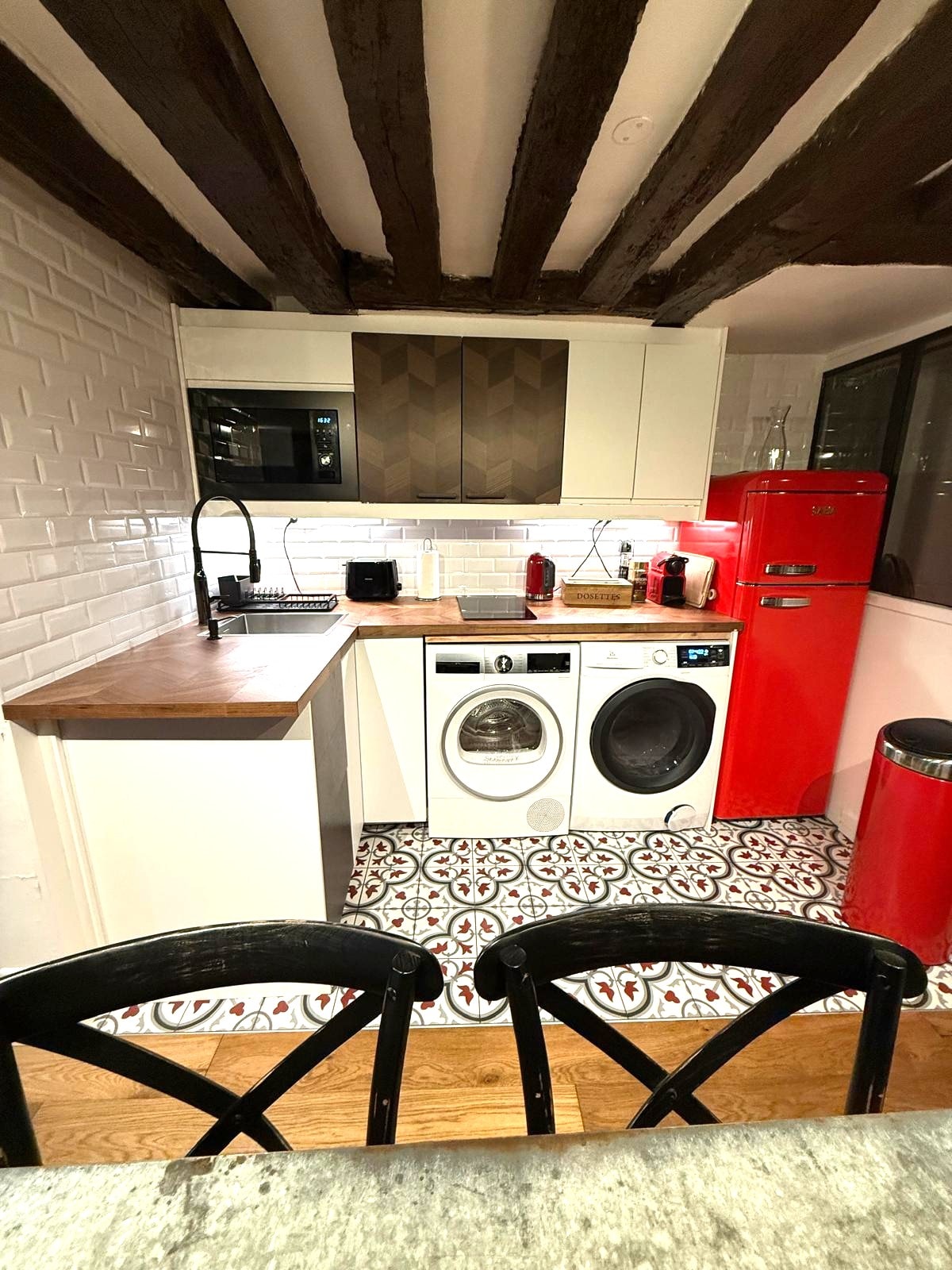 The exposed beams make this quiet apartment of 452 sq. ft. with a vaulted ceiling very charming. It can easily accommodate up to 2 people. It is situated within a walking distance from the lively Montorgueil and is a 10-minute walk from the Louvre Museum.