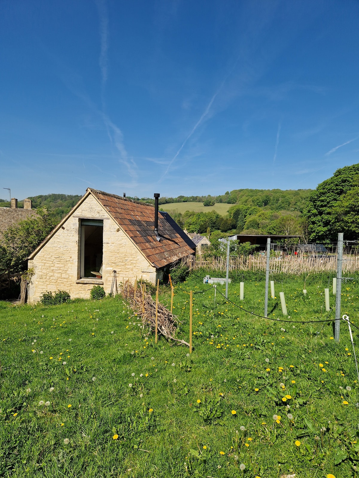 5 mins walk from Stroud train station, the wood clad Garden Studio is airy and modern and surrounded by green. It overlooks our garden, and apart from the trains (only 2 an hour) it’s peaceful but also so close to the pretty hilly town of Stroud. The bustling farmers market on a Saturday is a great fun and the commons and walks are spectacular. There is parking on our drive. To get to the studio walk down the gravel pathway past our front door. The key hold is by the studio door.