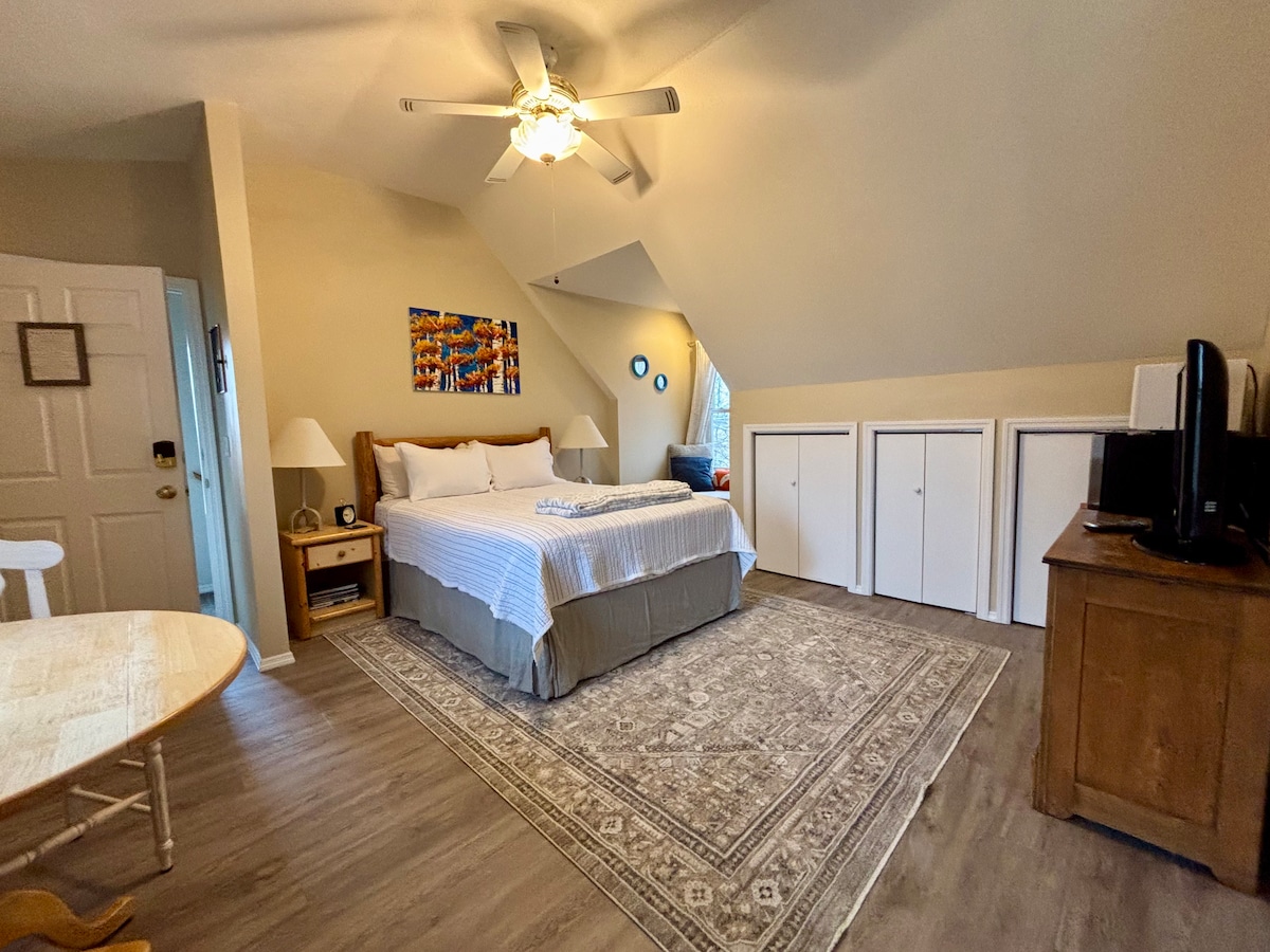 This charming second story studio sanctuary is full of light and warmth with picture windows, a breakfast nook, a lovely patio below. Comfortable queen bed. Perfect location! with easy access to downtown within a few blocks and immediate access to roads leading to wilderness, skiing and hiking. Treehouse in summer, cozy nest in winter.