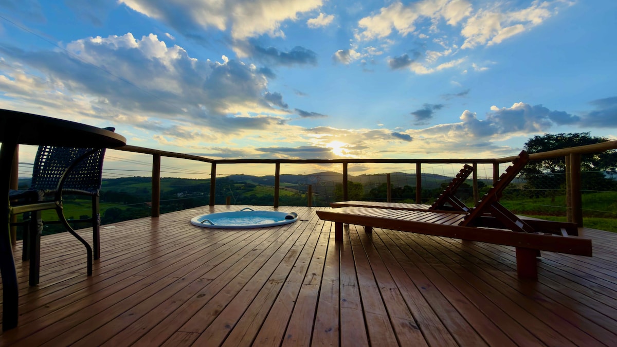 Discover the perfect getaway for you! Located inside a farm near Highway D. Pedro, our modern and cozy cabin is the ideal place for those seeking tranquility and special moments. Here you will find: A whirlpool, panoramic views and an exclusive environment, designed to provide *peace and quiet*. Imagine waking up to the birdsong, enjoying breakfast overlooking the mountains, and ending the day with a whirlpool bath under the starry sky.