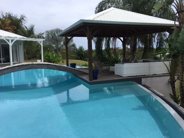 Kick back and relax in this calm, stylish space. Independent 100 m² villa located in Saint-François, secure and quiet, less than 10 minutes from shops, beaches, centers of St-François and Ste-Anne. It consists of 3 bedrooms, 2 bathrooms. Fully equipped kitchen with its central island open to the living area. A large covered terrace completes this villa with seating area, hanging chair and dining table for 6 surrounding the pool area and its wooden deck.