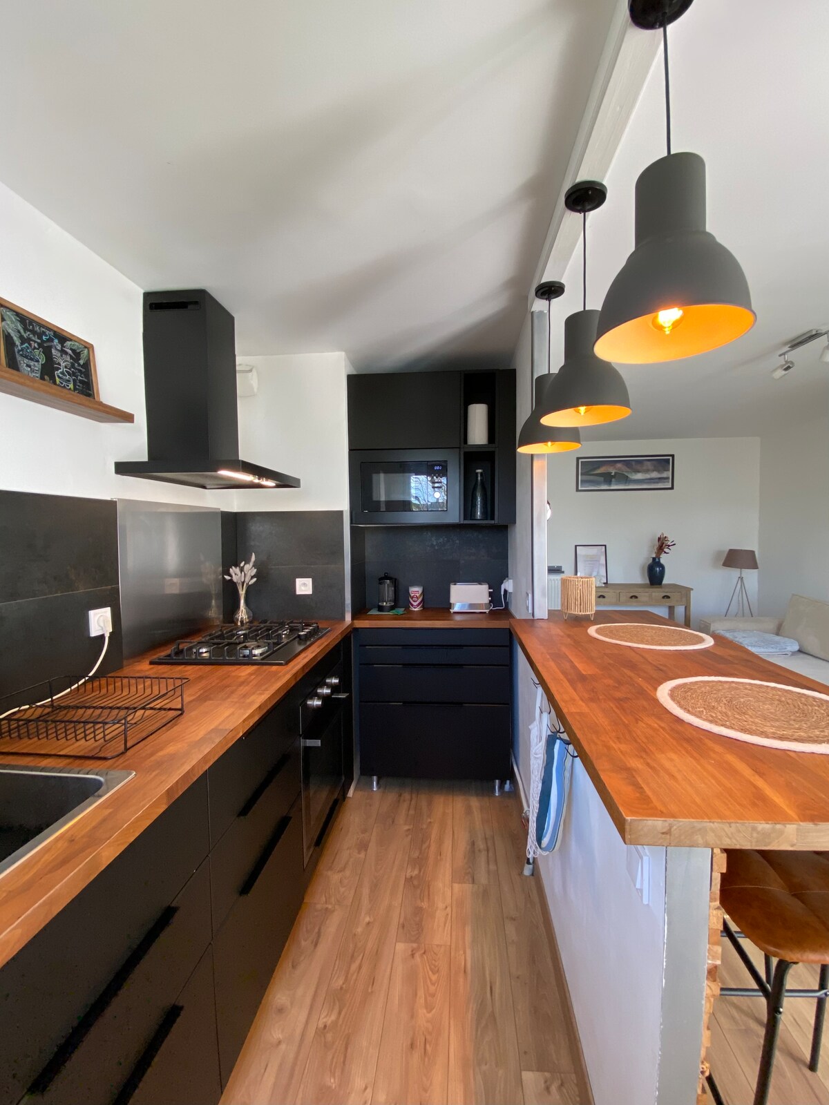 Accommodation comprising kitchen-living room, bathroom/WC, all in a fully self-contained 43 m² space with no shared areas, self-check-in and self-check-out, entrance on the main street, air conditioning, freezer, key box, located in the centre of Brains, a friendly village close to the countryside, 15 minutes from the airport, 8 minutes from Indre (Naval Group), 10 minutes from Planète Sauvage, 30 minutes from the sea, 23 minutes from Nantes with all amenities, delicatessen, general grocery store, café-restaurant, newsagent's, bus, HyperU and Lidl 6 minutes away.