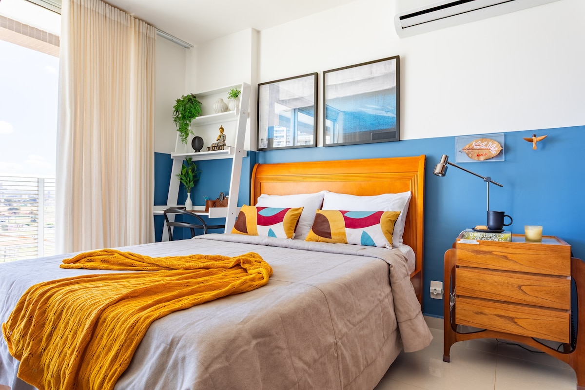 Flat on the Penthouse of Ed. Fusion Work Live, with a great location, in the North Hotel Sector, very close to the National Park. The apartment is differentiated, with 1 double bed and 1 sofa bed, bed and bath linen, TV, Wi-Fi, air conditioning, dining table, work table, cabinets, small kitchen, refrigerator, kettle, sandwich maker, air fryer, induction stove, pots, dishes and cutlery. The air conditioner is located in the hallway, in the bedroom we added a climate control unit.