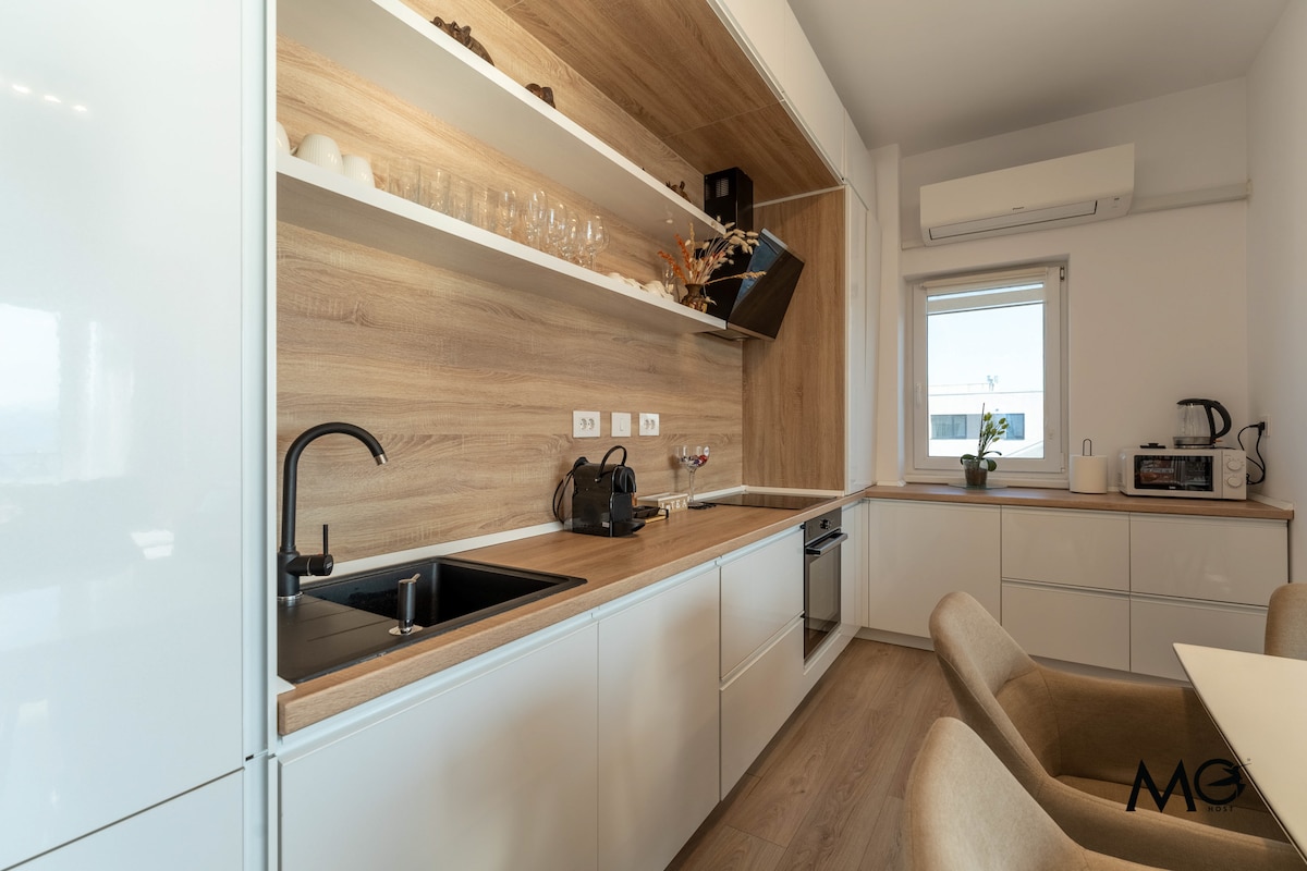 A uniquely and carefully designed, this apartment perfectly combines coziness with stunning Scandinavian accents. Situated in a new residential neighborhood, we go above and beyond to ensure a unique experience for our guests. Our home can accommodate up to 4 people and has its parking lot. The standout feature of this penthouse is the spacious terrace with a jacuzzi and a panoramic view over the mountains, being ideal for couples, business travelers, solo adventurers, or families (with kids).