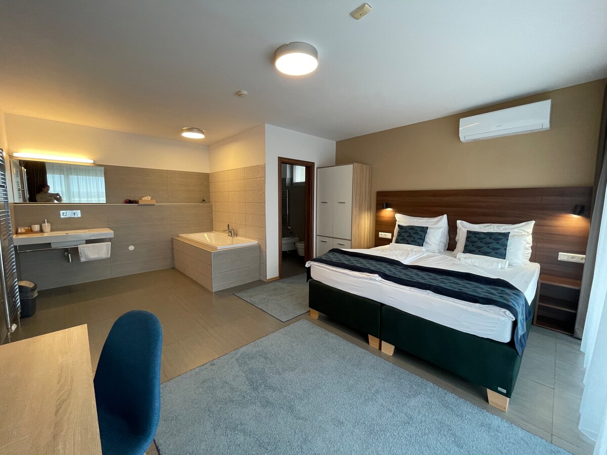 Tento apartmán pozostáva z 1 obývacej izby, 1 samostatnej spálne a 1 kúpeľne so sprchovacím kútom. Jedlo si môžete pripraviť v kuchyni, ktorá je vybavená varnou doskou, chladničkou, príslušenstvom na prípravu čaju, kávy a hriankovačom. Apartmán je vybavený minibarom, šatníkovou skriňou, pohodlnou posteľou a TV. Ubytovacia jednotka ponúka 2 lôžka. V budove sa nachádza vynikajúca reštaurácia a kedže je apartmán súčasťou hotela, je možnosť využiť všetky dostupné služby recepcie.