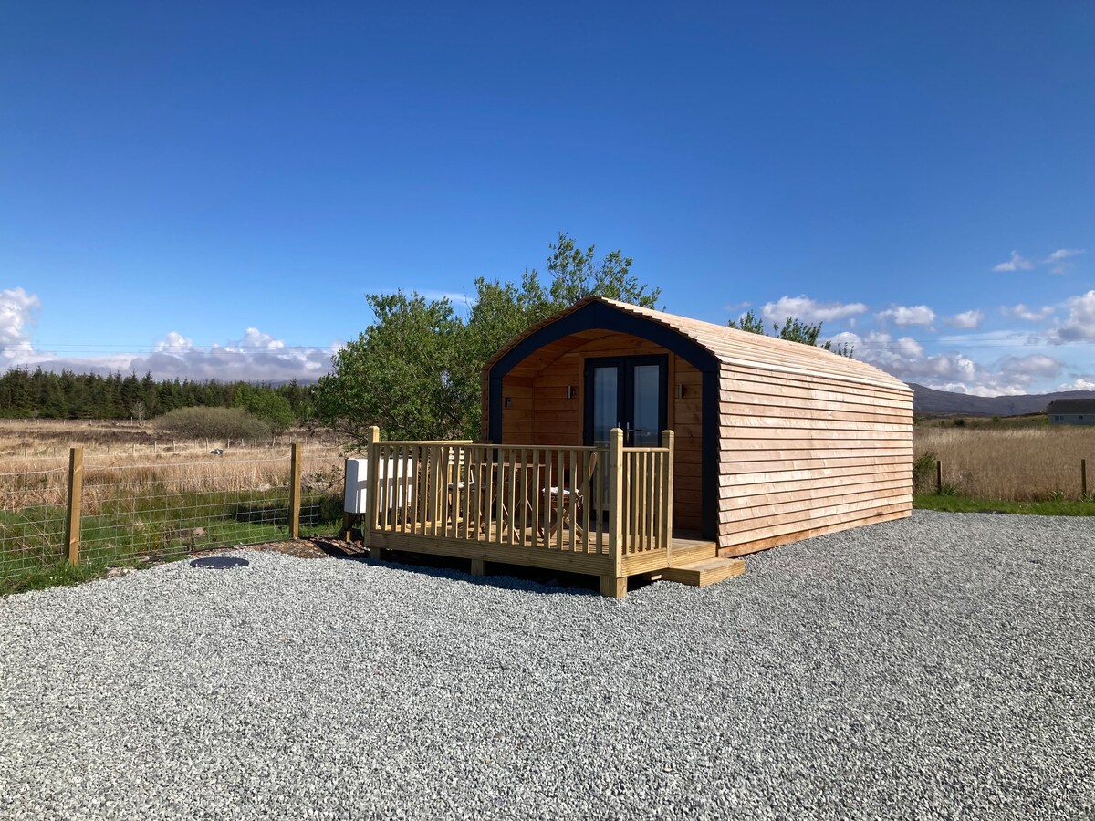 Gael is a modern cabin on a working croft, which captures uninterrupted views over Portree bay, Ben Tianavaig and the Cuillin hills in the far distance. The cabin itself has a full height atrium which includes a functional kitchenette, seating area, log-burner and a three-piece bathroom suite. The mezzanine level is accessed by a wooden staircase featuring a comfortable double bed. Situated just off the Scorrybreach trail this is the perfect launchpad for your Skye adventure.