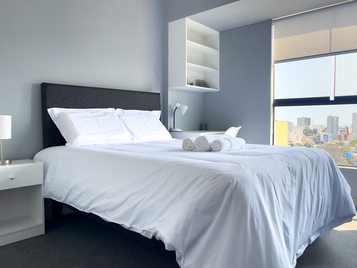 Brand new apartment in an unbeatable location, close to Campo de Marte, National Stadium, Parque de las Aguas, Hospital Rebagliati Hospital, La Rambla Mall, restaurants, parks, everything within easy reach and in a safe area. The apartment is excellently equipped, kitchen with utensils and appliances, laundry with washer-dryer, clothesline, bedroom with large closet, TV, and workspace. Modern dining room with 4 chairs, living room with sofa bed, and armchair, entertainment center with TV, and balcony with incredible view.