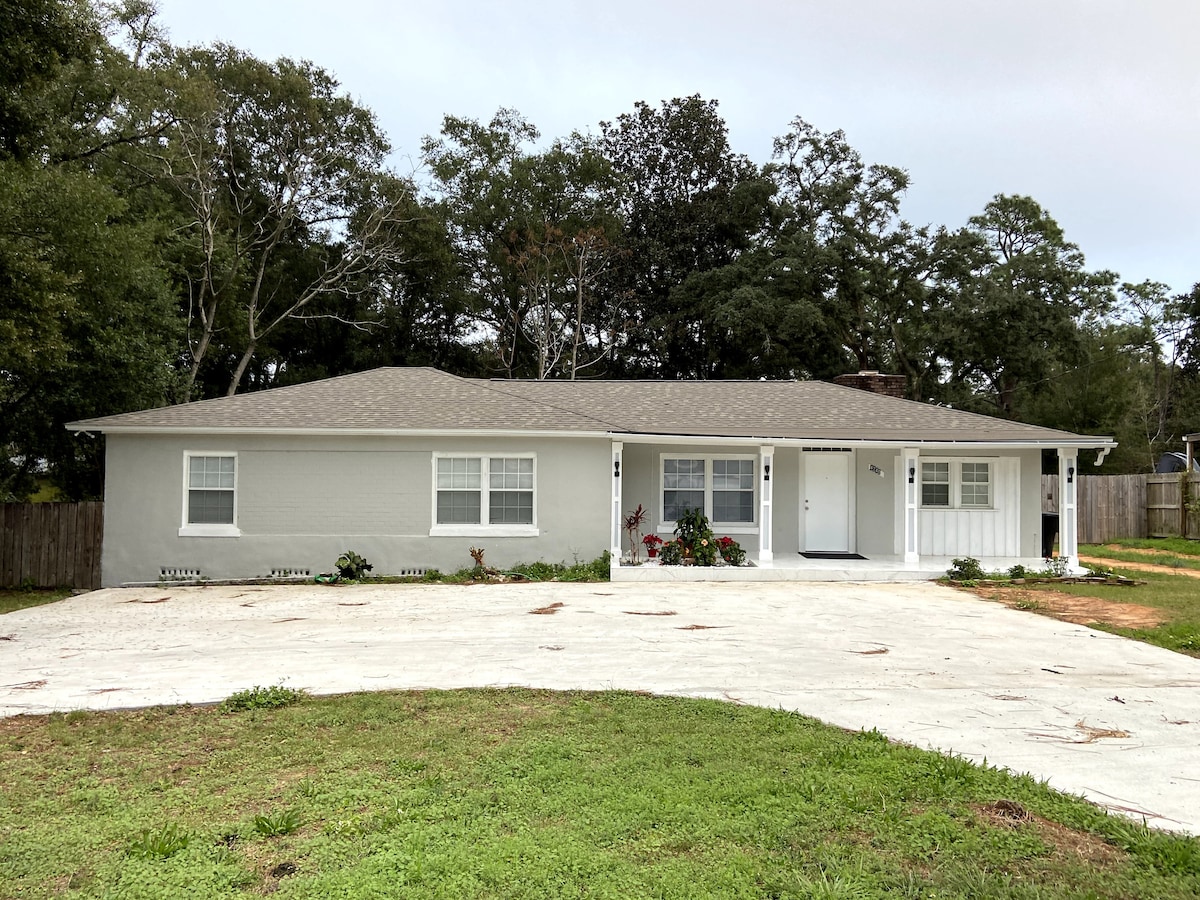 Newly renovated rustic/modern home suitable for your family ✦ 1 mile from shopping, interstate, restaurants ✦ 3 miles to the PNS Airport ✦ 15 mins from the beach ✦ 11 miles to Naval Air Station Home of the Blue Angels ✦ 6 miles to downtown restaurants and vibrant entertainment ✦ Close to Pensacola State ✦ Bedroom 1 King bed ✦ Bedroom 2 Queen bed ✦ Bedroom 3 Queen Bed ✦ Bedroom 4, 5 with 2 double beds ✦ Covered outdoor seating with grill ✦ Easy parking ✦Free Wifi .