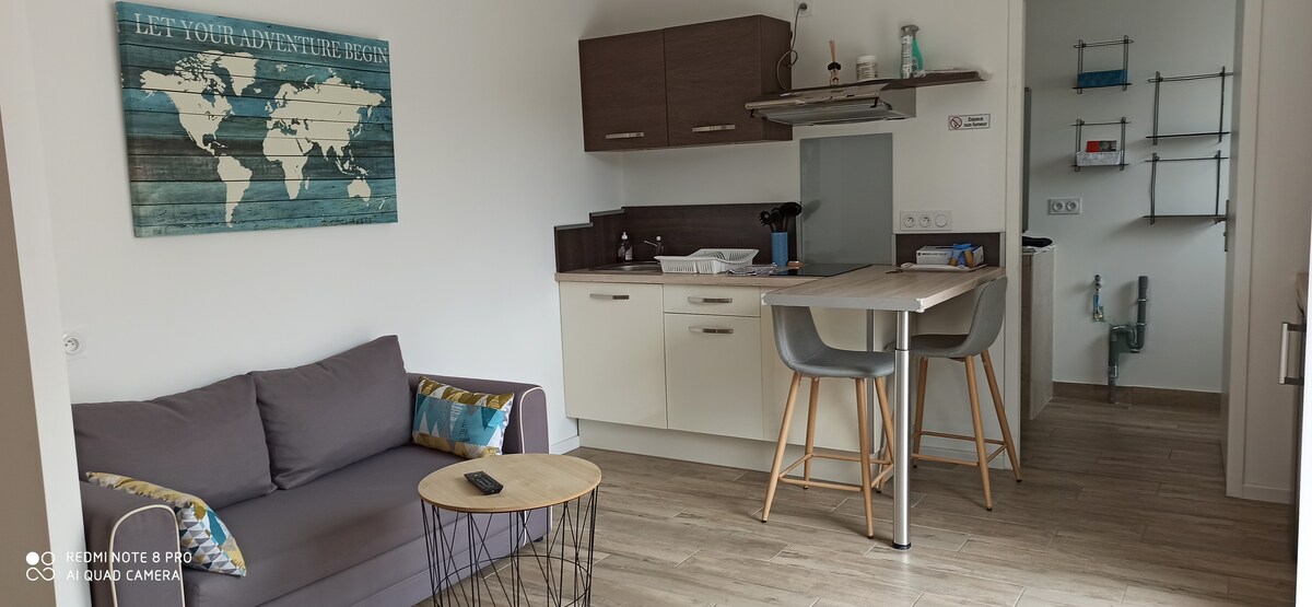Cozy apartment, ideally located for a perfect stay! Surface area: 46 m² – Sleeps up to 4 people 🛏️ Spacious bedroom (double bed + large storage) + double sofa bed in the living room 🍽️ Fully equipped kitchen 🛁 Bathroom with bathtub 📺 TV with Netflix, Disney+, Prime (account login required) 🛜 WIFI ❄️ Reversible air conditioning 🌿 Covered terrace with table and swing 🚗 Private, supervised and free parking 📍 10 min from the train station on foot, 2 min from a supermarket