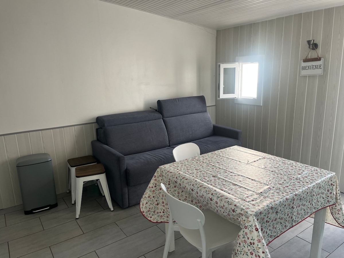 Close to everything: shops 400 m away and beaches 500 m away 33 m² single-storey house in a very quiet area. Fully equipped kitchen with range hood, ceramic hob, oven, microwave, dishwasher, fridge Bathroom with bathtub/shower, toilet, sink and washing machine 100 m² exterior with shaded terrace, garden furniture, barbecue and 2 deckchairs. Totally enclosed space. Bedroom with a 190 x 140 double bed and a 140 x 90 mezzanine bed, large closet Sofa bed type BZ.