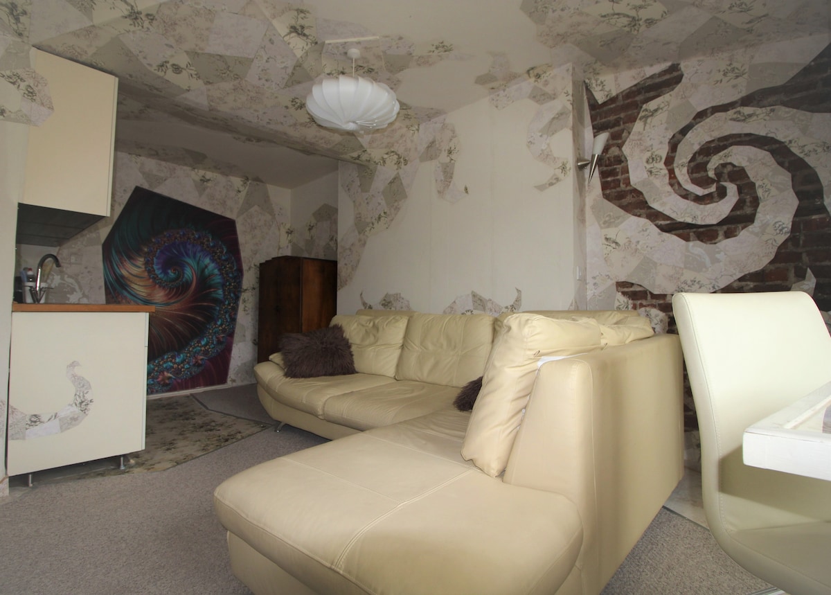 A uniquely designed and decorated fantasy suite. Unlike anywhere else. With beautiful decor, artworks, and custom created pieces of furniture that accentuate the total design of the room. It is a very large space with a double bed, a comfortable lounge area with luxurious cream leather L shaped sofa, and a dining area set in a big bay window with sideways views of the sea. Private en-suite shower/WC. Kitchenette with sink, fridge, microwave, kettle, and toaster. Central heating and WiFi